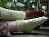 Ce sont des chaussettes toe-up (des orteils vers la cheville). Le talon renforcé en rangs raccourcis et le gousset sont entièrement adaptables à votre cou-de-pied avec quelques calculs expliqués au début de ce patron.