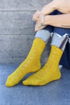 Waking up in the early morning and stepping outside with a hot cup. As the world slowly wakens the sun glistens on the leaves, the blades of grass, and on every flower petal. Turing the landscape into a field of dancing glitter. This fleeting moment as nature slowly awakens to a new day is what inspired the Dew Drop socks.