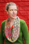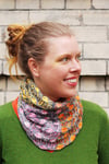 - DK weight yarn in 1 solid main color and 1 or more contrasting (variegated or self-striping will work); yardage estimates are for a cowl sized as the sample — use more or less yardage, and/or a different yarn weight, for a larger or smaller piece