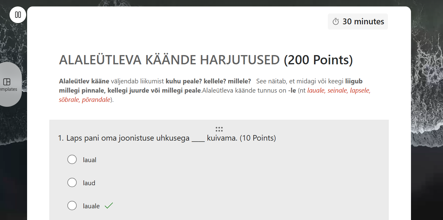 Õppija peab iga lause juures valima sõna, mis on alaleütlevas käändes. Ülesanne sisaldab 20 valikvastusega küsimust, mis on selged ja jõukohased nii 2.–5. klassi õpilastele kui ka täiskasvanutele, kes õpivad eesti keelt A1–A2 tasemel. Iga õige vastus annab 10 punkti, maksimaalne tulemus on 200 punkti, ning lahendamiseks on ette nähtud 30 minutit.