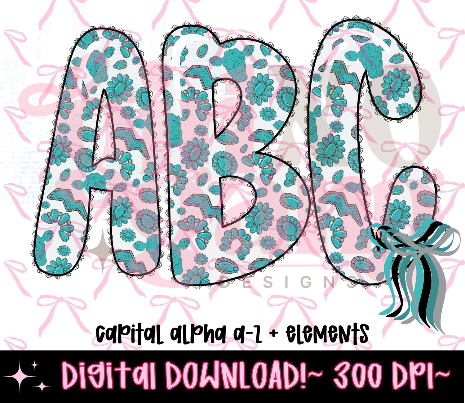 Turqoise western Preppy lace doodle alpha set png letters, capital alpha letters included plus elements