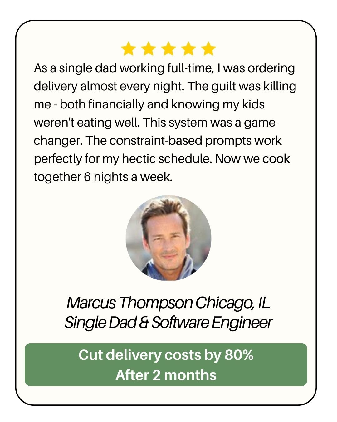 You've tried cookbooks promising "30-minute meals" (that assume everything's prepped). You've downloaded apps suggesting "Moroccan-spiced lamb" when you have ground beef and broccoli. Here's why nothing has worked...