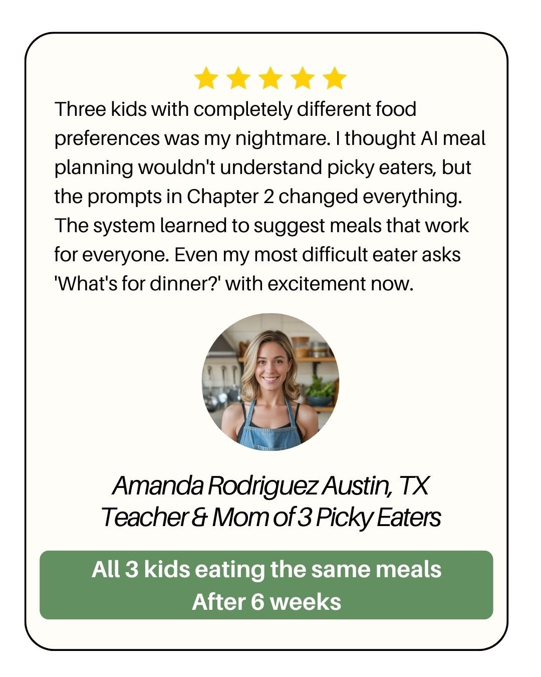 The first and only system that combines artificial intelligence with human taste to eliminate meal planning stress forever. This isn't another cookbook – it's a complete lifestyle transformation.