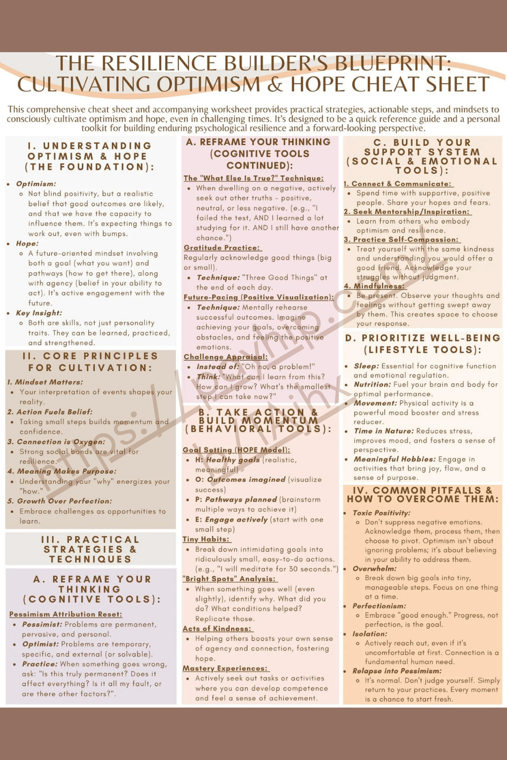 This comprehensive cheat sheet and accompanying worksheet provides practical strategies, actionable steps, and mindsets to consciously cultivate optimism and hope, even in challenging times. It's designed to be a quick reference guide and a personal toolkit for building enduring psychological resilience and a forward-looking perspective.