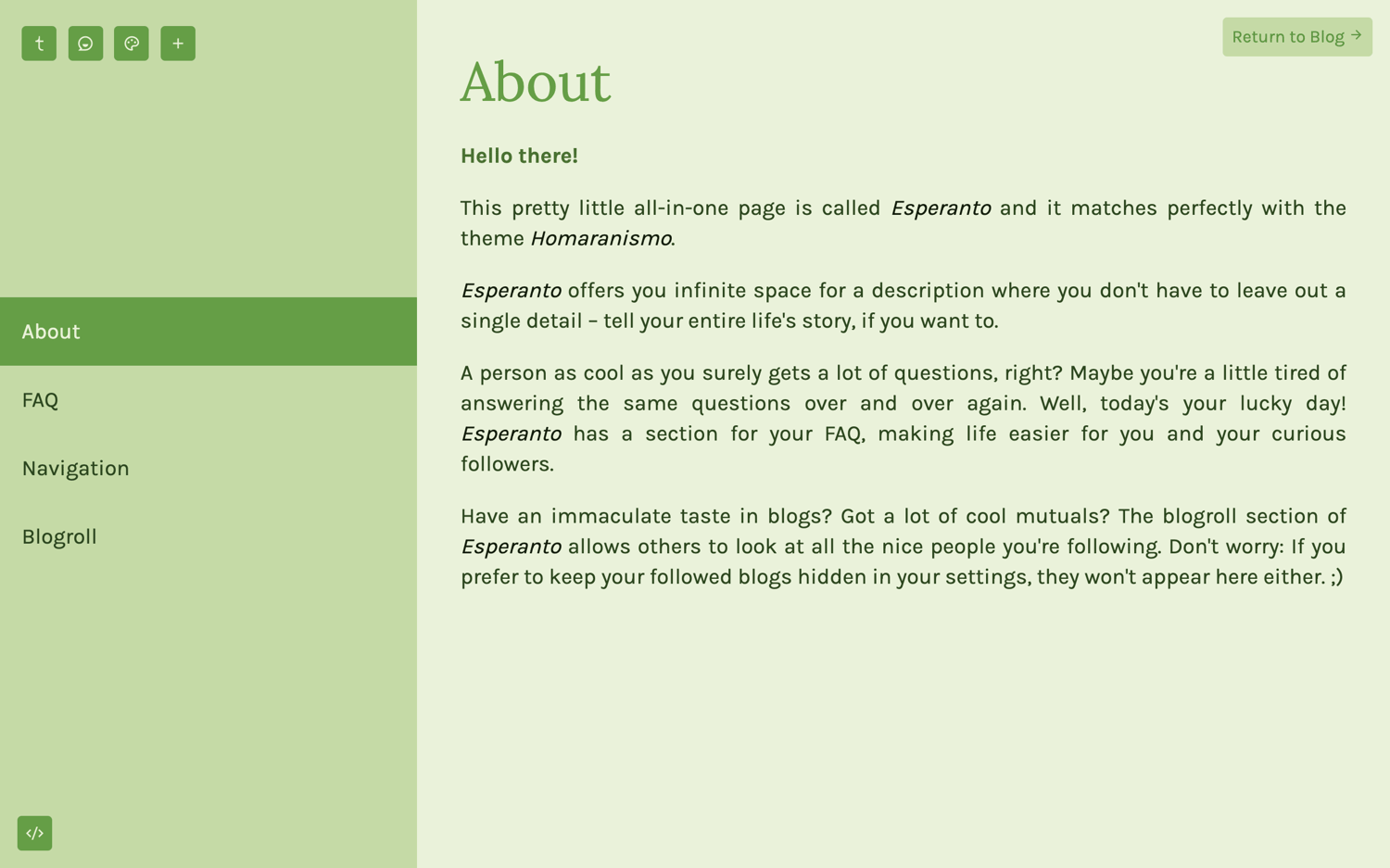 Fully responsive all-in-one-page optimized for use on tumblr blogs.See a live preview here.