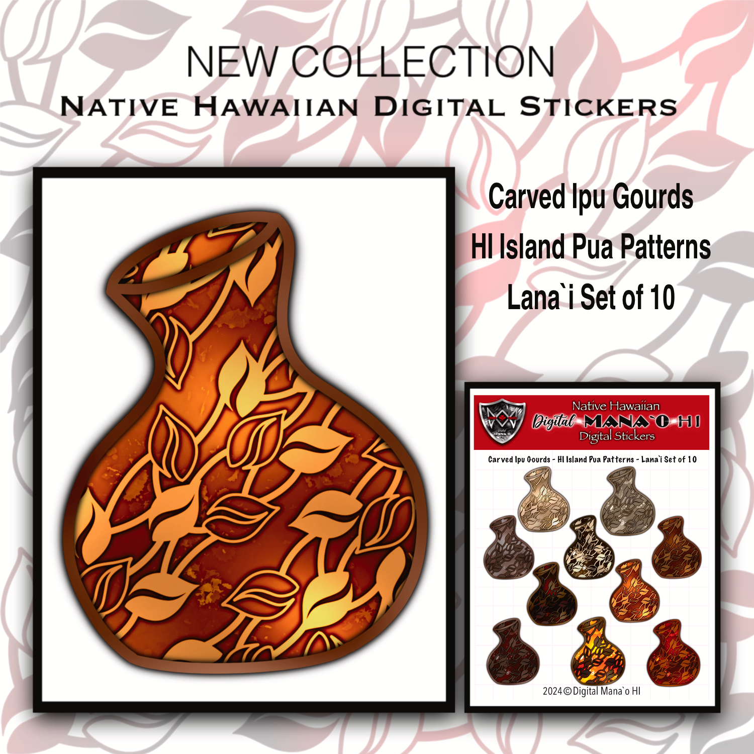 Digital Mana`o HI - Carved Ipu Gourd Digital Stickers - HI Island Pua Patterns - Lānaʻi Set of 10