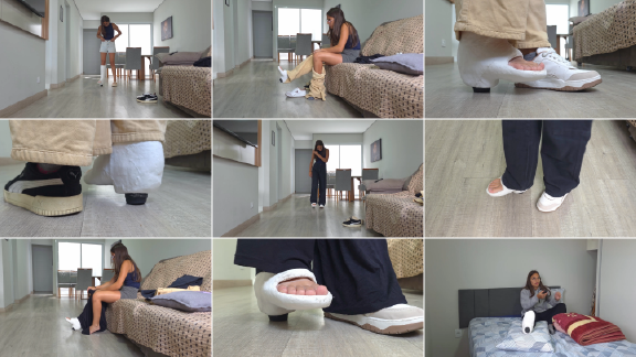 Caterina probiert drei verschiedene Hosen mit ihren Turnschuhen und Flip-Flops an. Mit jeder Kombination geht sie ein paar Schritte und zeigt sie der Kamera.
