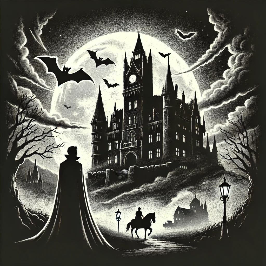 Step into the eerie, gothic world of Dracula with this stunning black-and-white digital illustration. Featuring a towering, ominous castle under a full moon, surrounded by bats, swirling mist, and twisted trees, this artwork captures the haunting atmosphere of Bram Stoker’s legendary novel. In the foreground, a shadowy figure—possibly Count Dracula himself—stands ominously, while a lone rider approaches the castle in the distance.