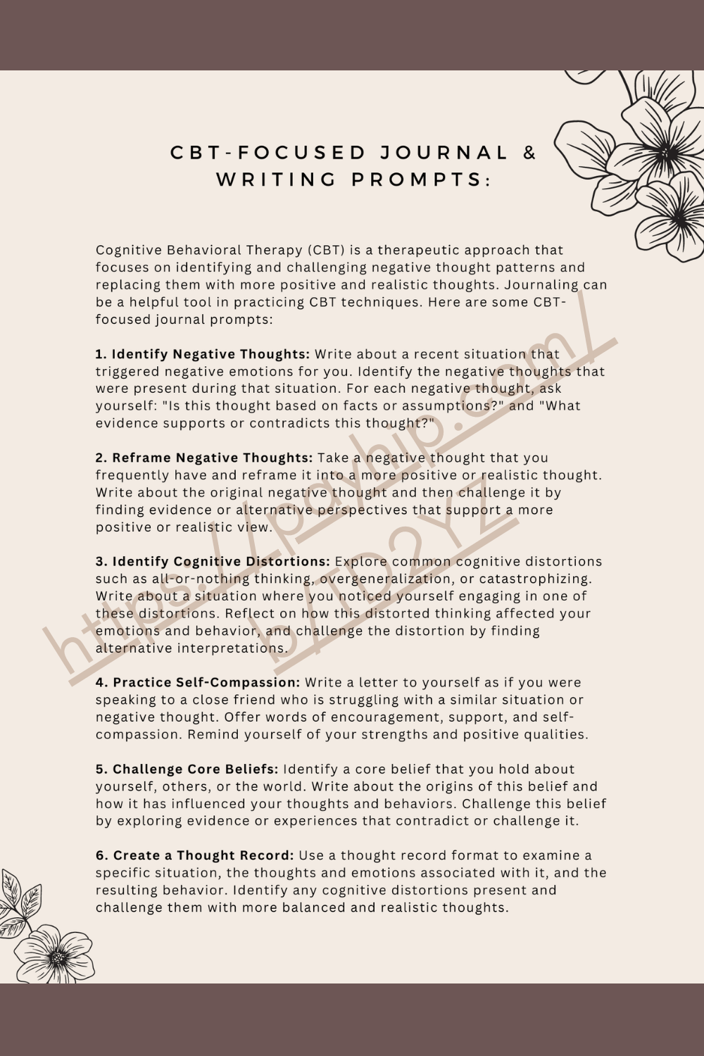 Journaling and writing prompts that can help with practicing key Cognitive Behavioral Therapy (CBT) tools and techniques. Journaling is a core CBT skill, and these prompts can help with identifying and challenging automatic negative thoughts, core beliefs, and much more!