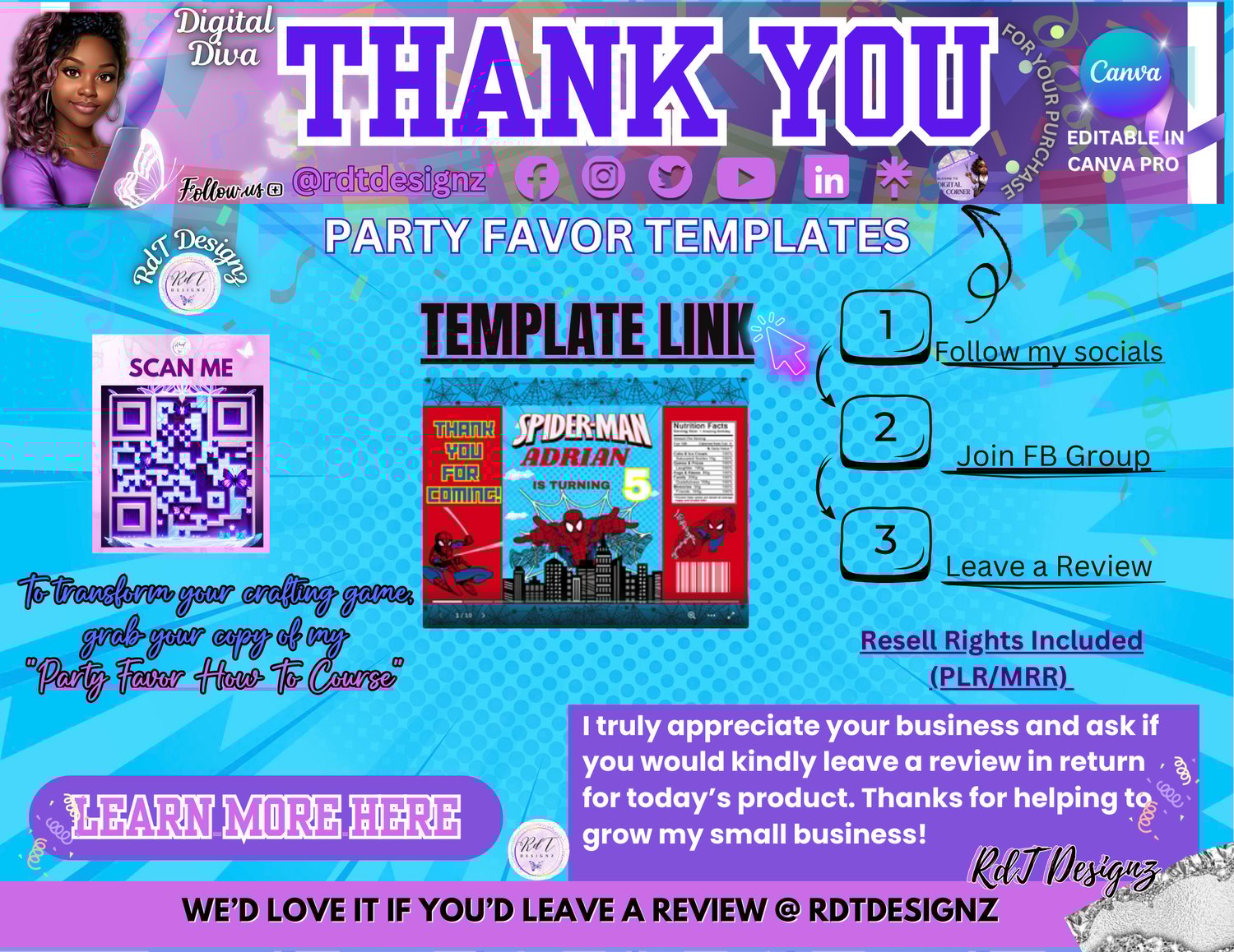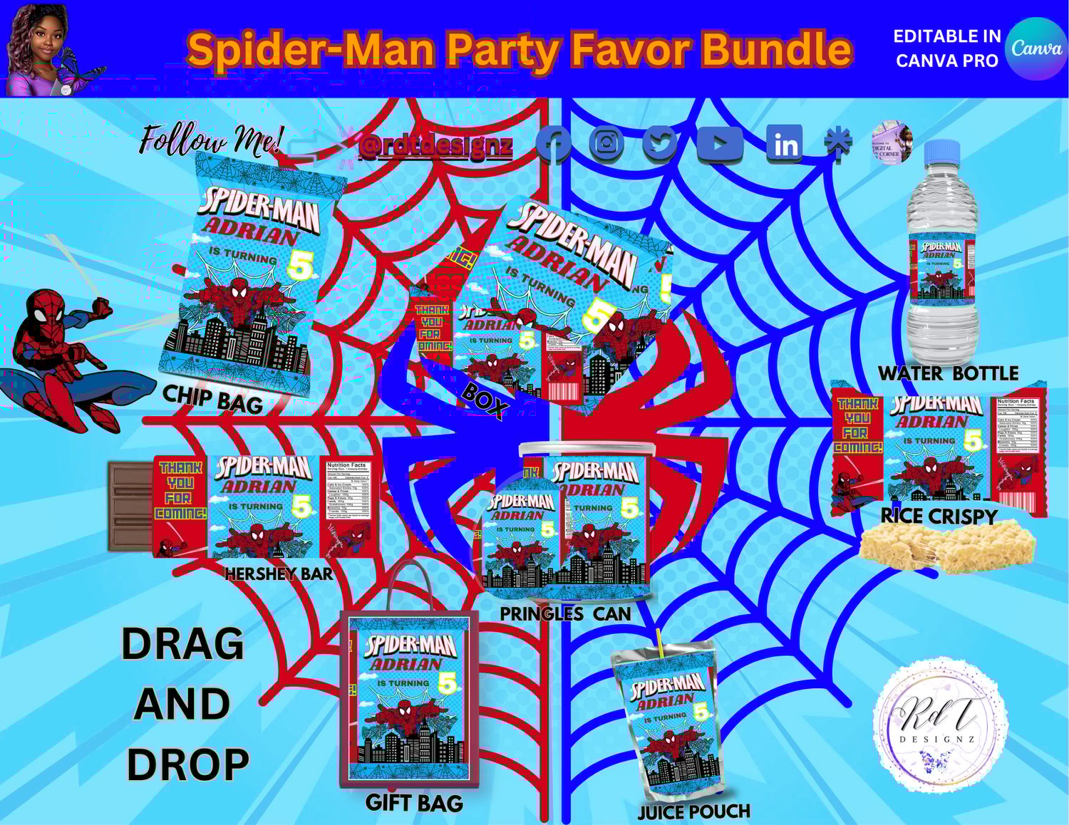 Elevate your projects with our exclusive digital template bundle featuring the legendary friendly neighborhood Spider-Man! Perfect for fans, content creators, and designers alike, this party favor bundle includes stunning, easy-to-use templates inspired by everyone's favorite web-slinger. Whether you're crafting social media posts, invitations, or creative projects, these versatile templates will add a heroic touch to your work — all for just $1! Don’t miss out on this limited-time deal to bring a splash of superhero spirit to your designs.
