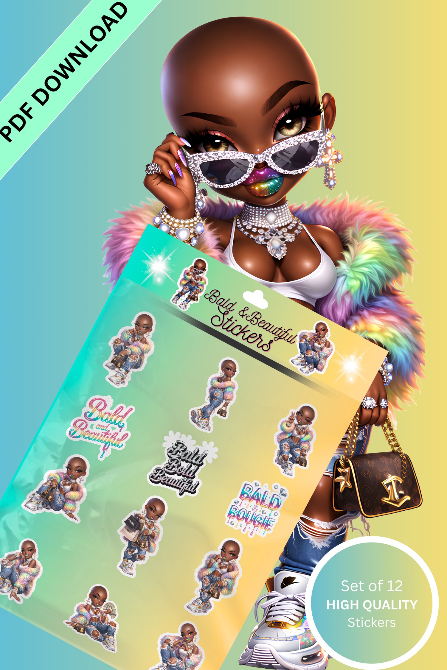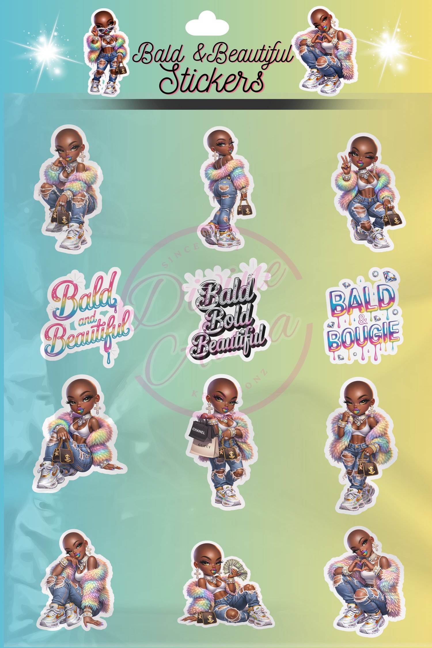 Each sticker showcases empowering vibes with phrases like “Bold & Beautiful” and “Bald & Boujee,” celebrating beauty, individuality, and self-love.