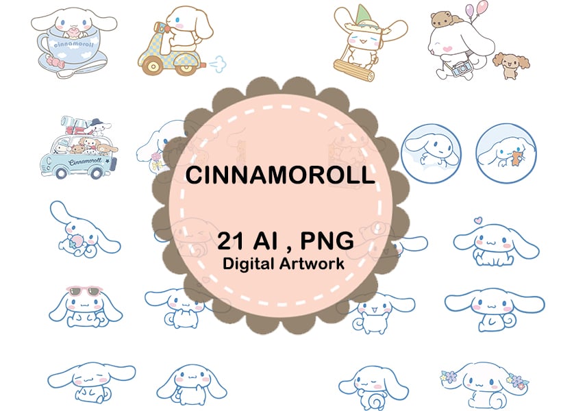 Elevate your creative projects with this exclusive collection of 20 large PNG and Illustrator AI digital artworks inspired by the kawaii world ofCinnamoroll ! Perfect for artists, designers, and enthusiasts who love unique, high-quality digital assets.