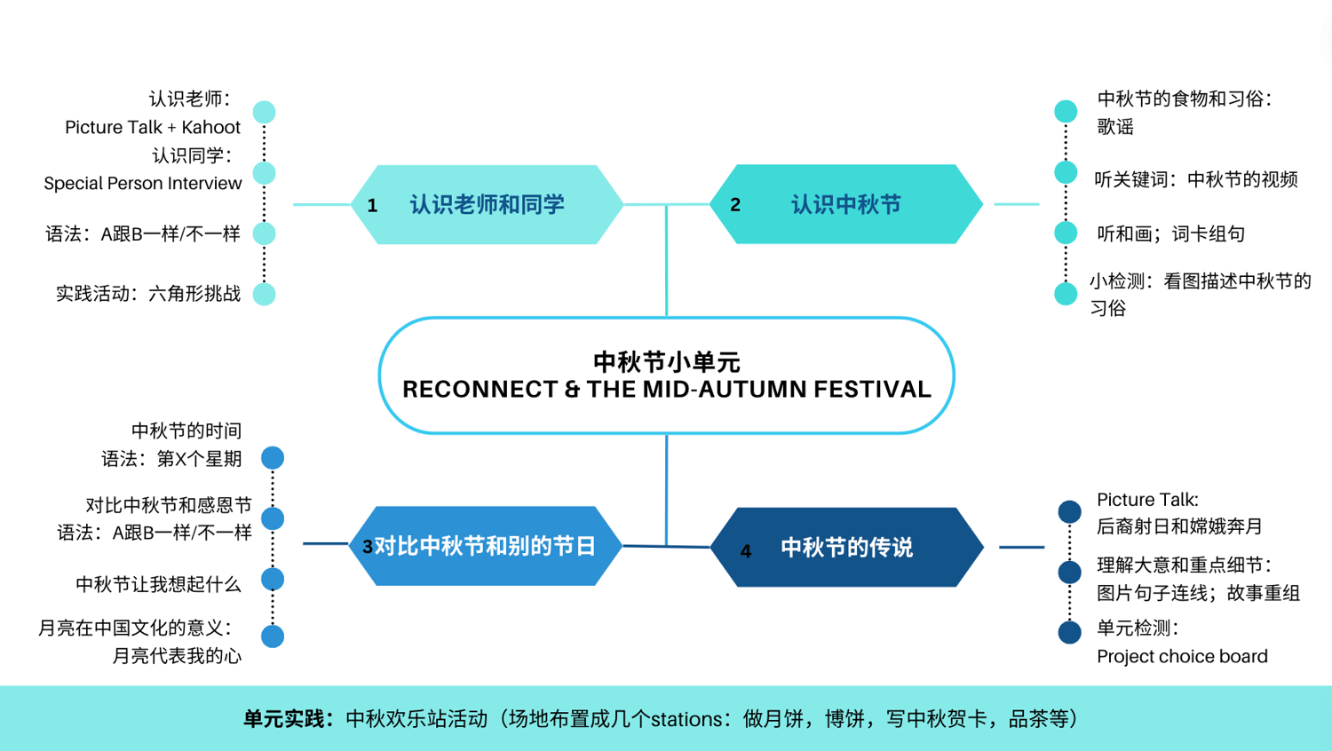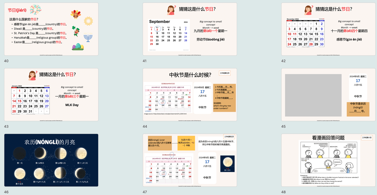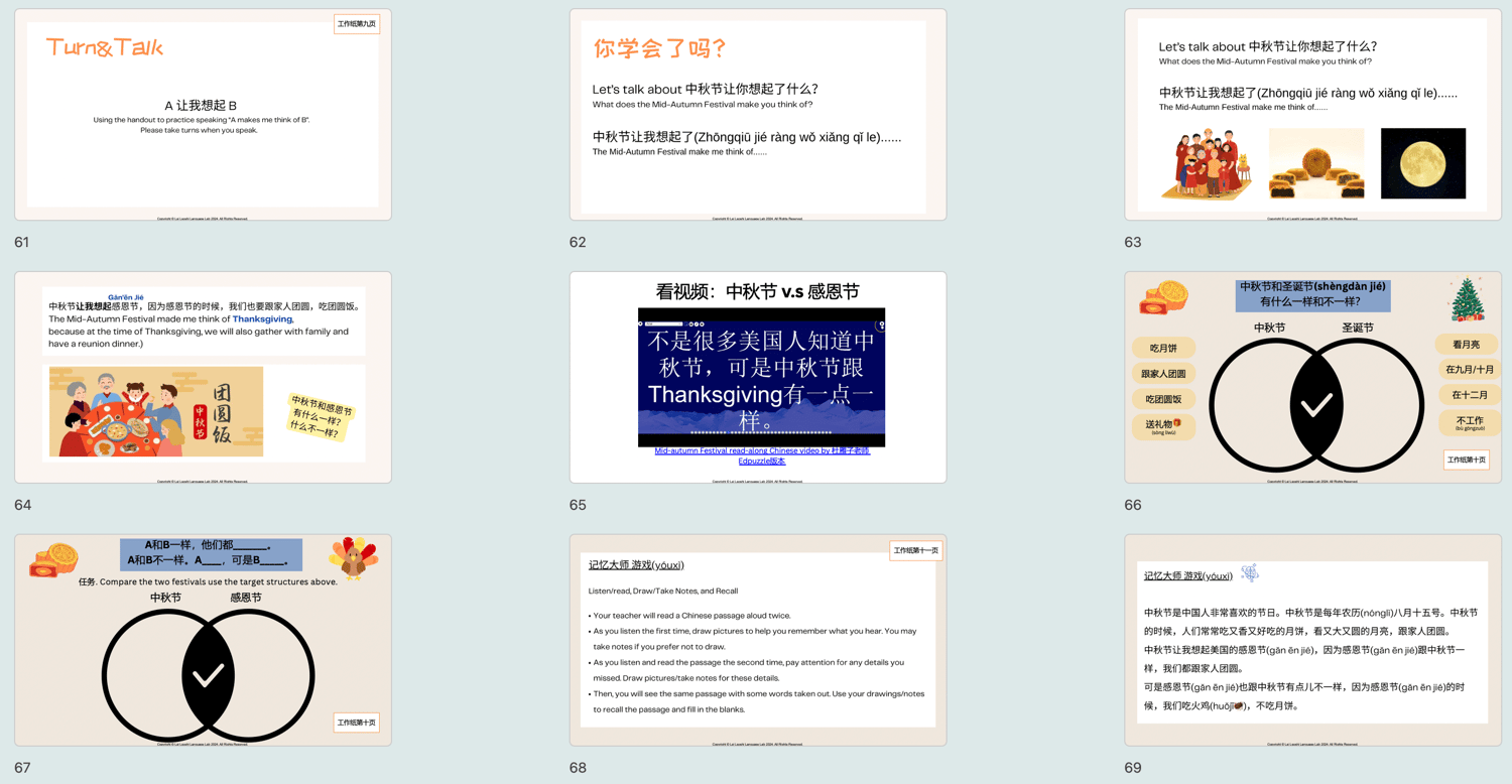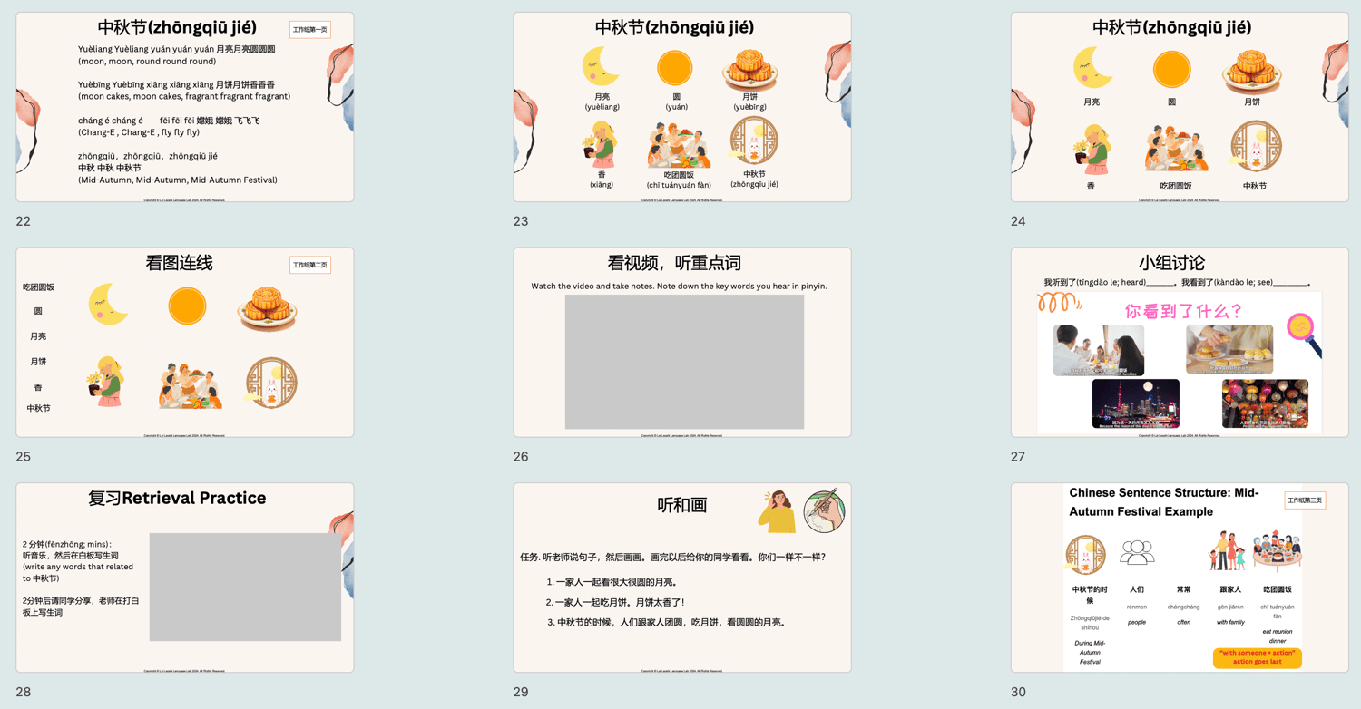 - 文化探索: 学生将学习中秋节的传统习俗,理解月亮在中国文化中的重要性,并将中秋节与自己国家的节日进行对比,增强文化认知。