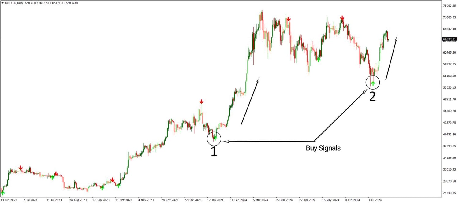 - Buy Setup: On the Bitcoin daily chart (BTCUSD), green arrows marked key bottoms. These buy signals can be confirmed with candlestick or chart reversal patterns for higher accuracy.