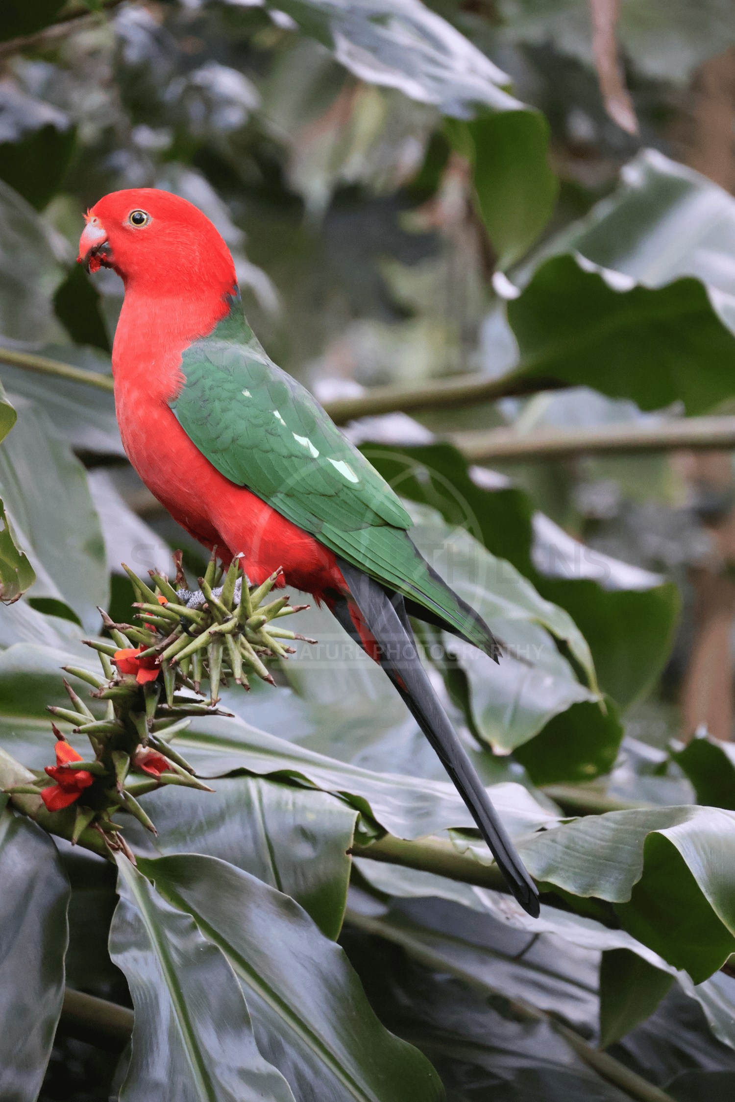 A striking side profile of a male Australian king parrot perched gracefully on a branch, his vibrant crimson chest and emerald wings on full display. With his regal colours and poised stance, he brings a bold splash of rainforest beauty to the frame nature’s royalty in feathers.