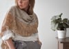 Mist Shawl is an asymmetrical shawl worked sideways from tip with regular side increases along its left edge, joining the two colourways with the intarsia method. Shawl features a textured panel in CC with a gently meandering leaf pattern, which is separated from the main body in MC by a narrow lace enclosed slipped stitch braid, also in MC.