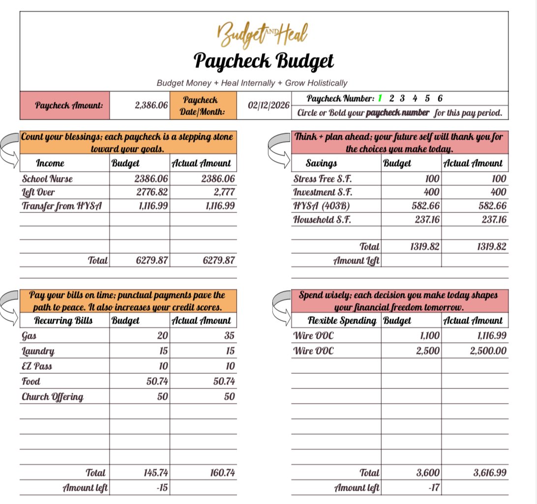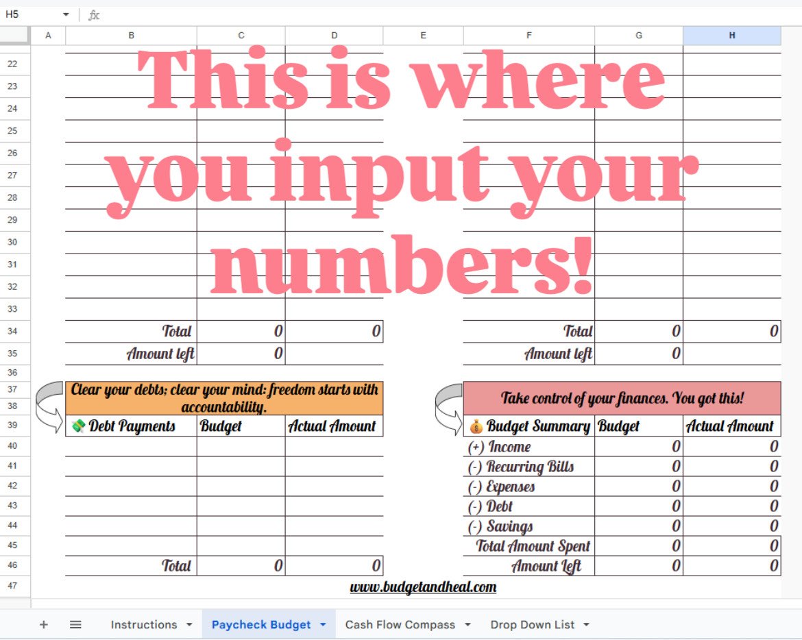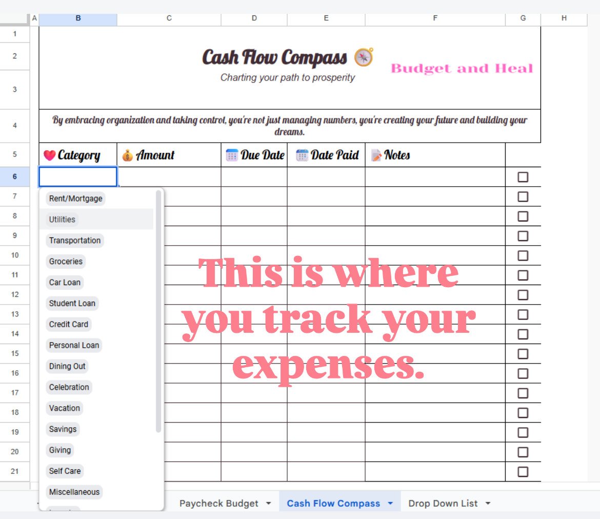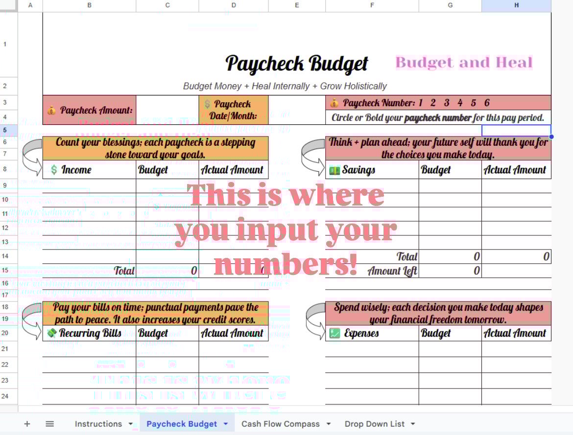 Scroll through the images above to see a video where I walk you through budgeting my paychecks using this tool. Watch it before, or after you download-it’s like having a money coach by your side as you take your first steps. By the way, here's my YouTube channel where you can find more videos of me using the Paycheck Budget and Cash Flow Compass: https://www.youtube.com/@budgetandheal
