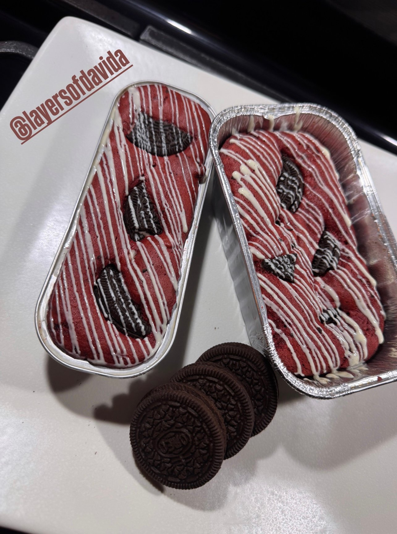 Ingredients: all-purpose flour, granulated sugar, unsalted butter, eggs, cocoa powder, red food coloring, vanilla extract, baking powder, salt, Oreo cookies, milk chocolate, white chocolate.