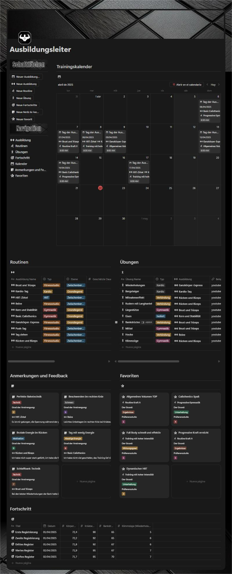 Diese Notion-Vorlage ist für alle gedacht, die ihr Training ernst nehmen möchten – ohne sich in losen Zetteln, verstreuten Apps oder dem klassischen „Was war heute nochmal dran?“ zu verlieren. Hier kannst du deine Routinen, Übungen und Fortschritte klar, visuell und organisiert zentralisieren.