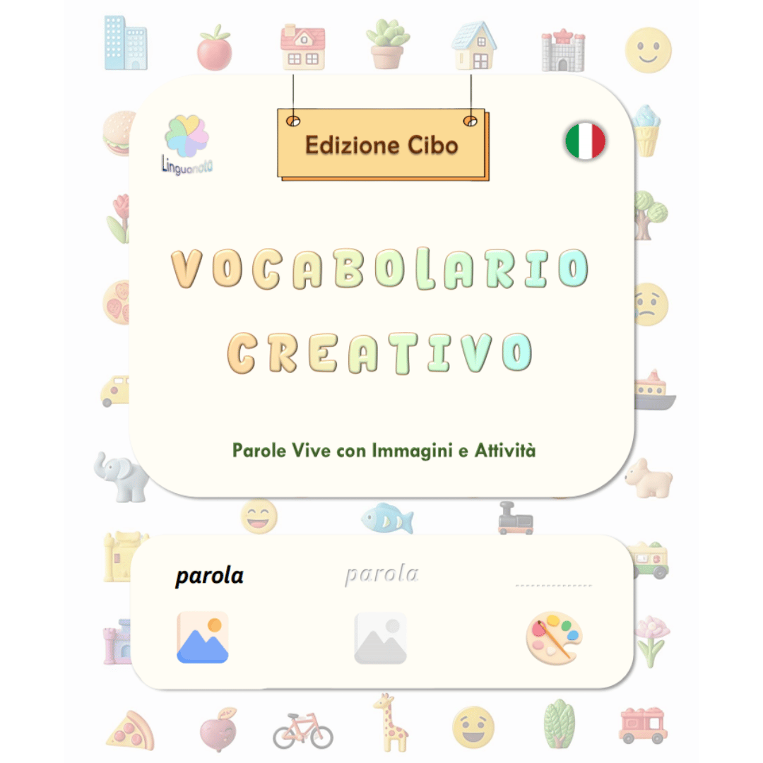 - The "See-Color-Draw" Method: 10 activity pages featuring three categories: Cibo, Bevande, and Condimenti.