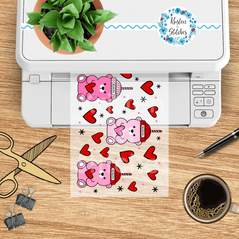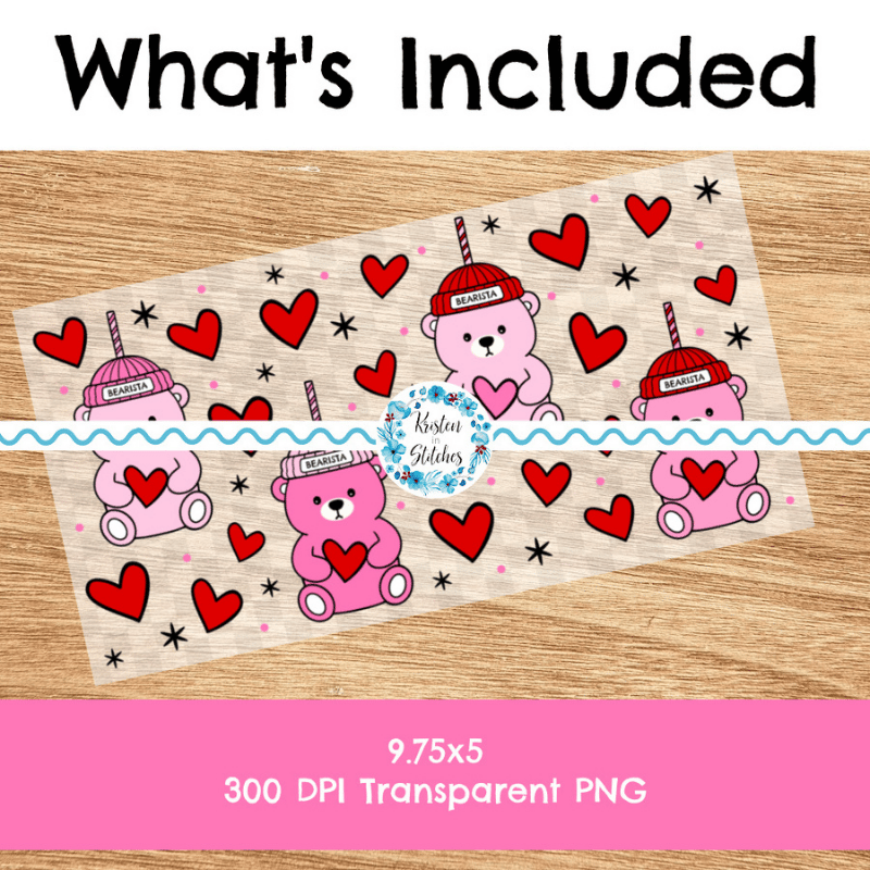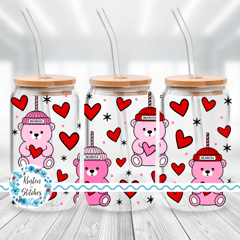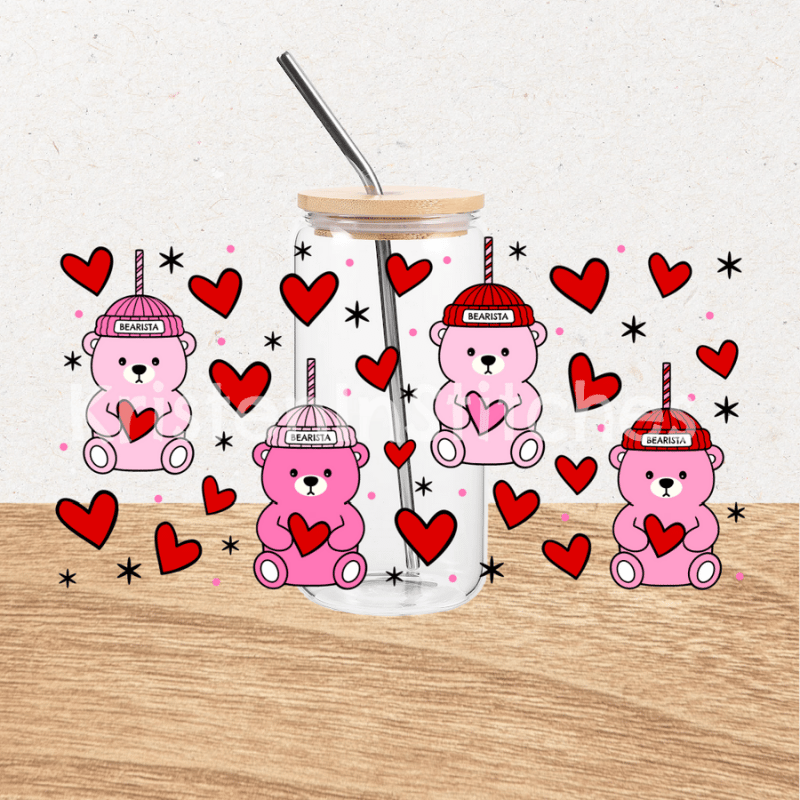 Features barista teddy bear straw cups and red hearts.