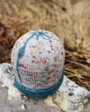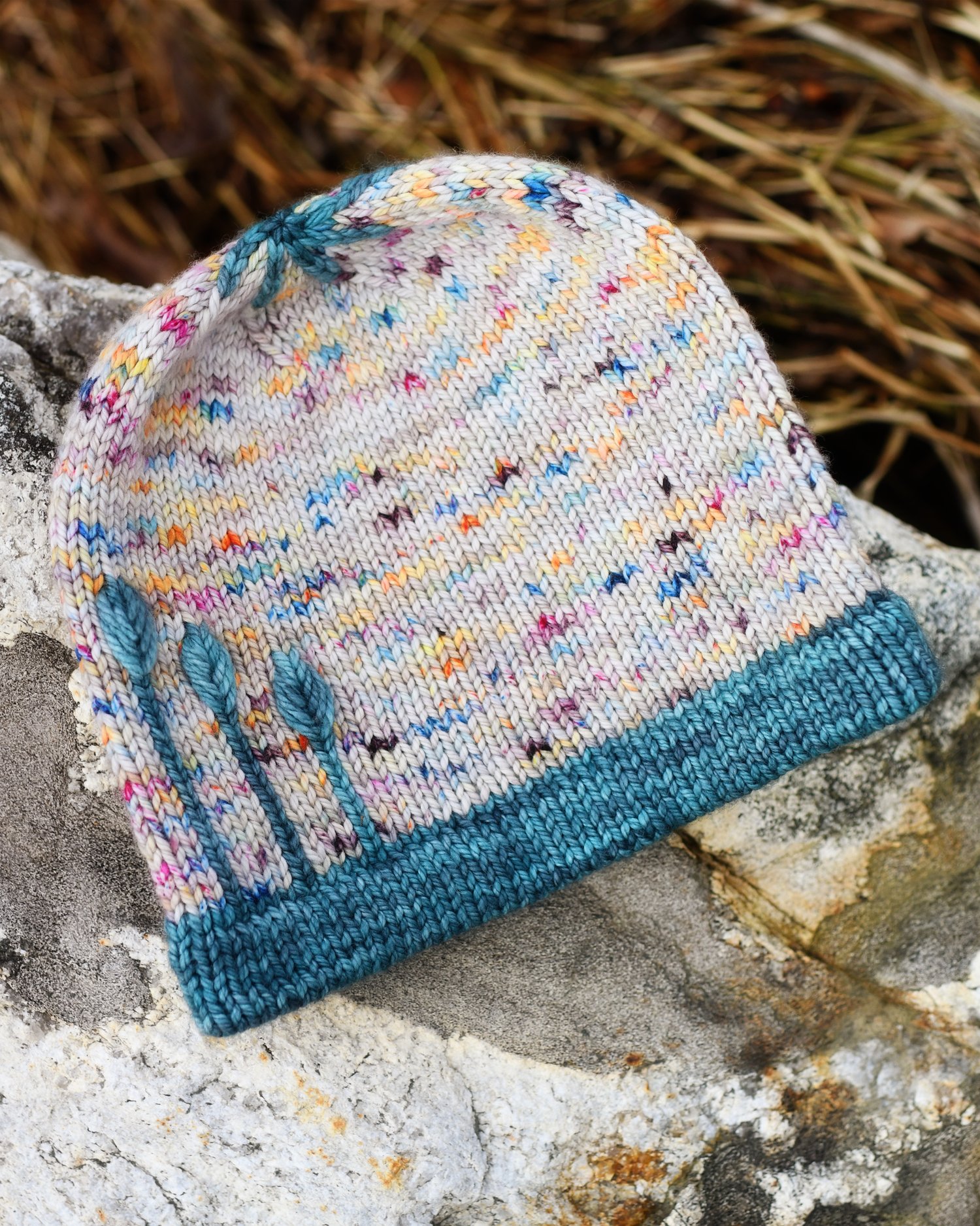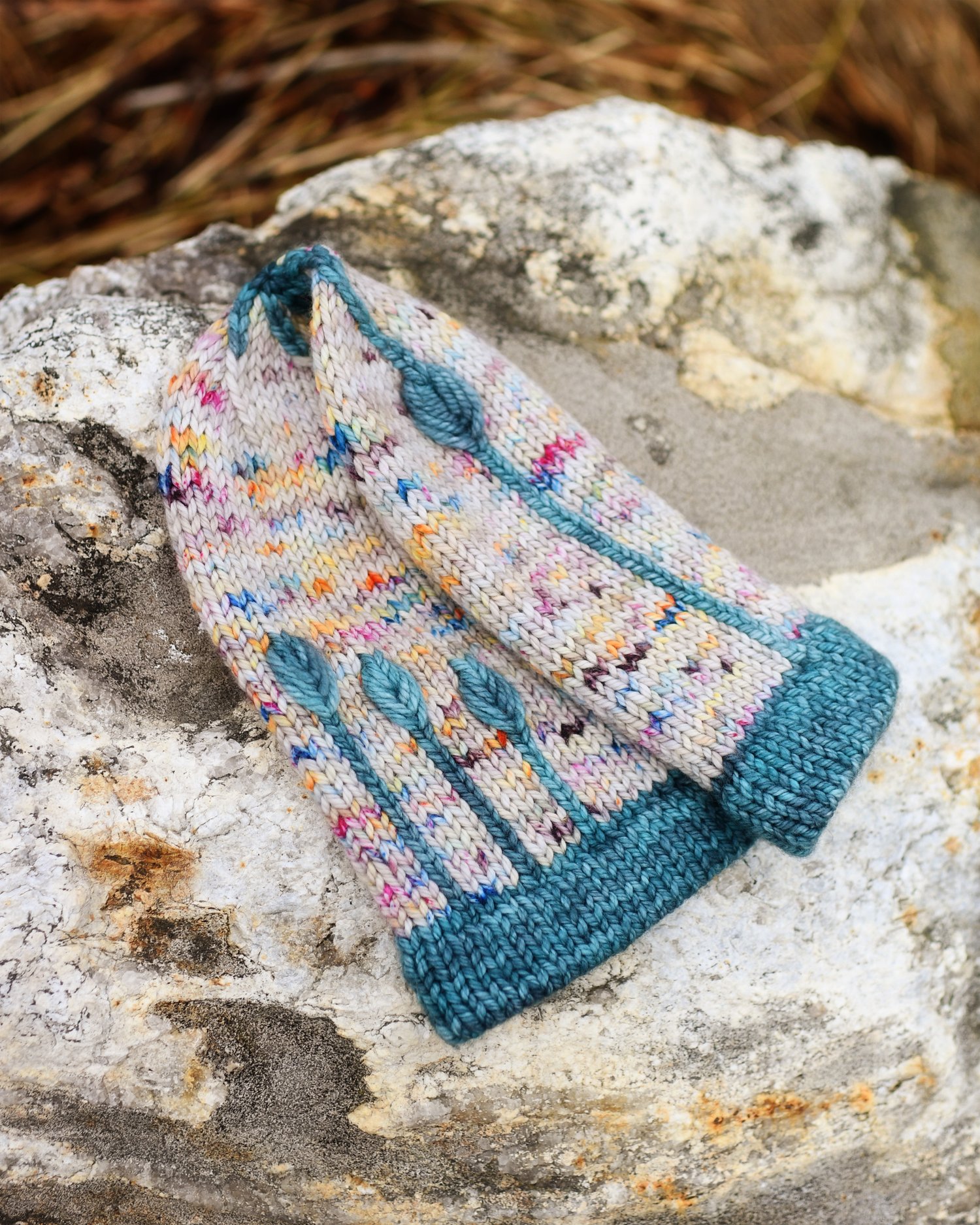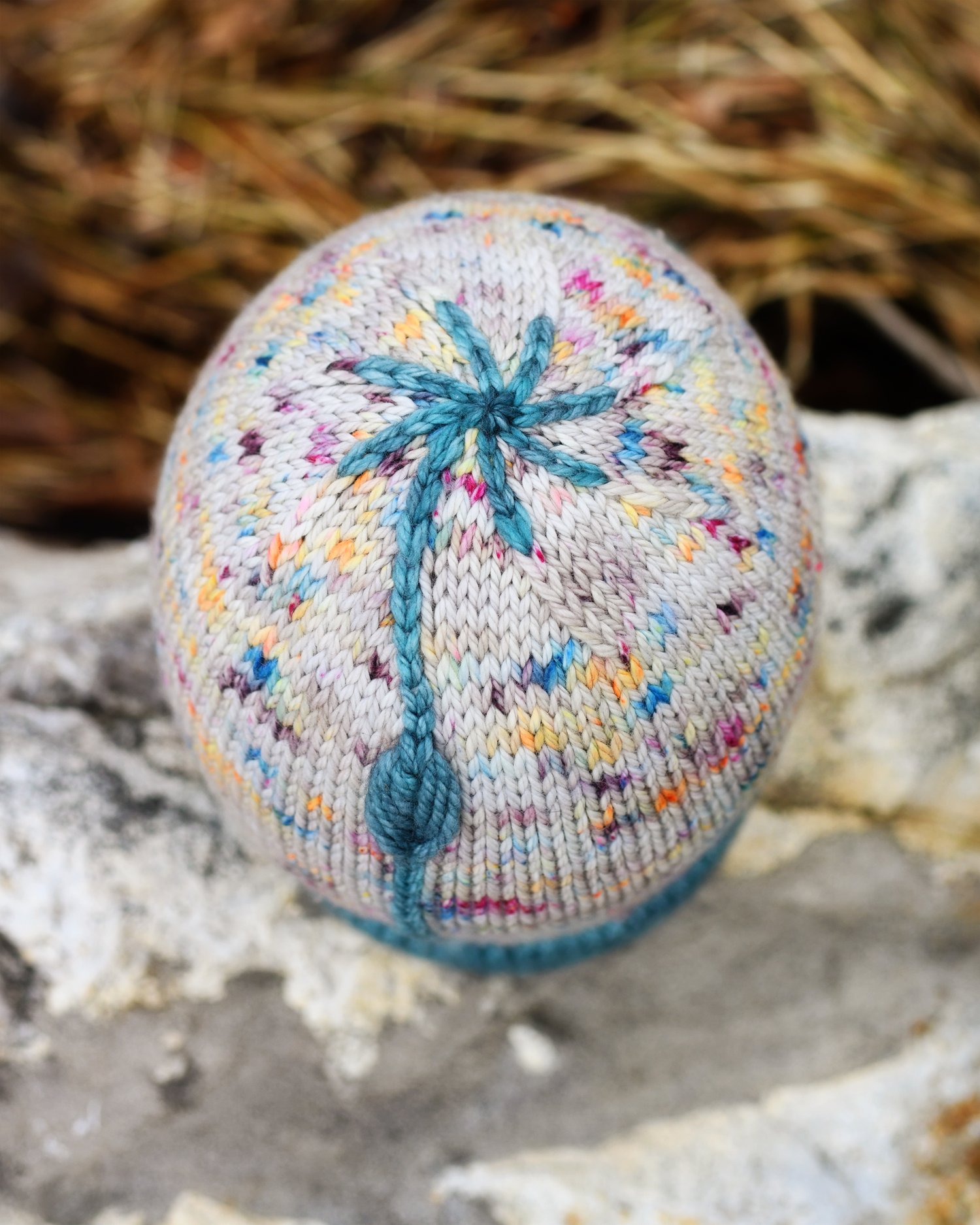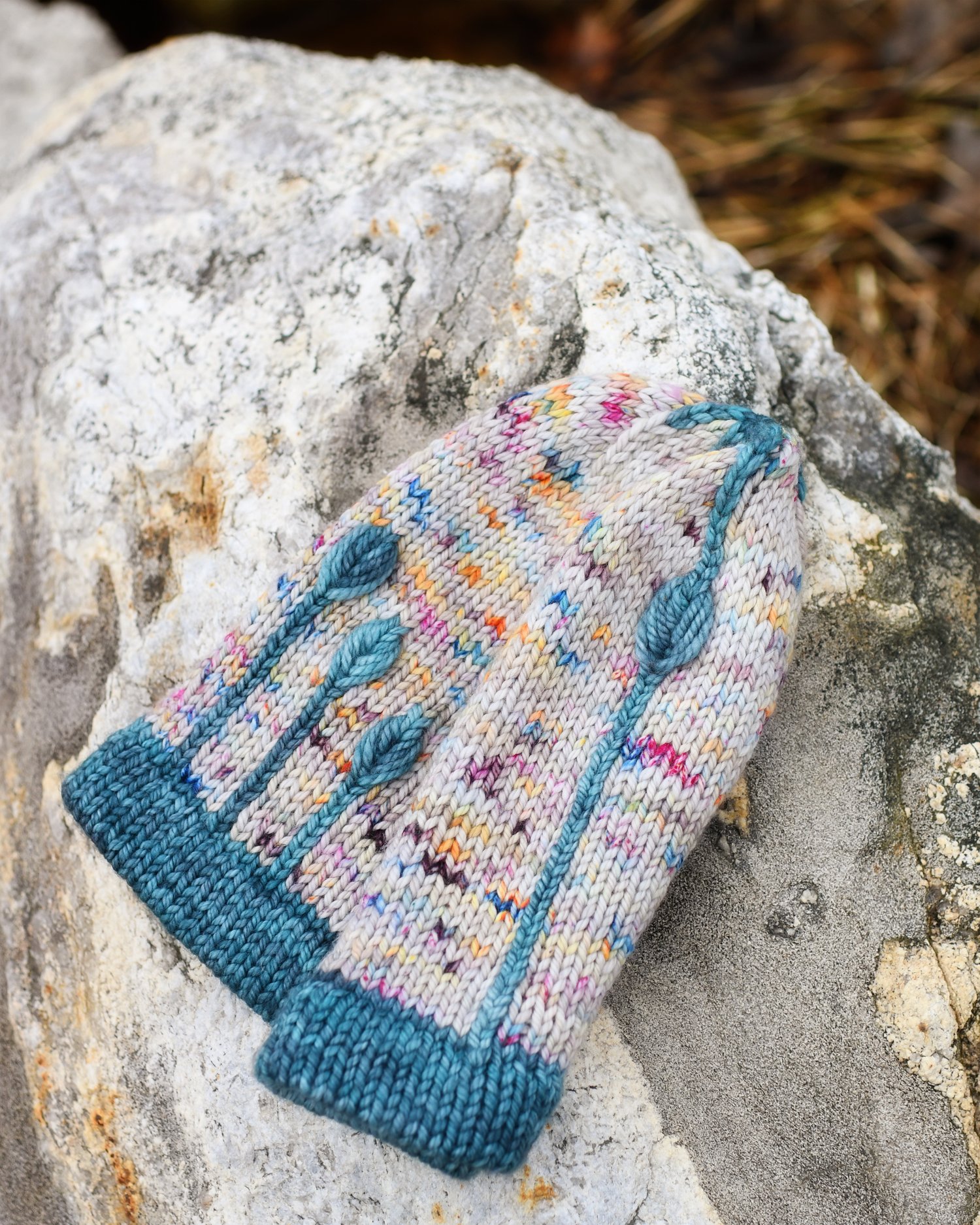 This is very nearly all stockinette in the round, which I find to be some of the most soothing knitting in the world. You’ll start with a turned hem (don’t worry, I’ll talk you through it), add as many little stems and buds as you’d like (yes, you can totally work them in different colors), then finish off with a little starburst at the top.