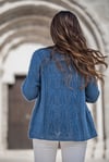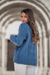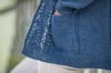 até os ombros. Os ombros são modelados usando carreiras encurtadas e depois unidos com um remate a três agulhas. No final, tricotamos uma ourela em cordão (i-cord) sobre pontos levantados ao longo das frentes e ourelas do decote. As mangas são trabalhadas a partir de pontos levantados em redor da cava,