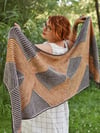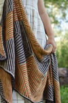 A graphic rectangular shawl in two-color Brioche and Garter stitch stripes with a seamless modular construction.