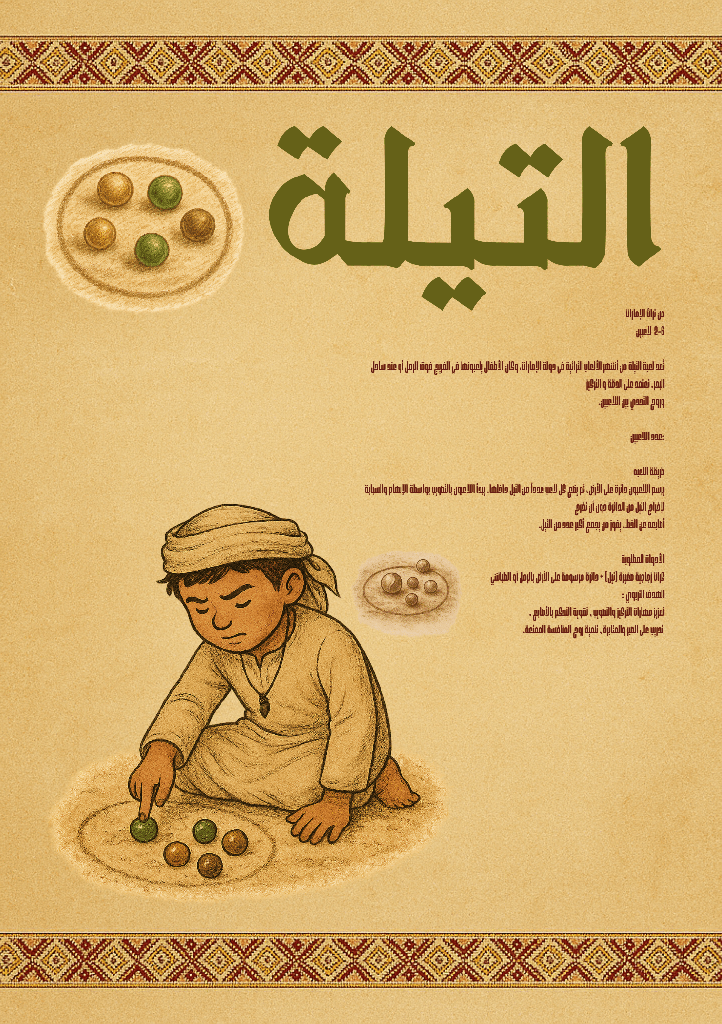 انغمسوا في التراث الإماراتي مع مجموعة ألعاب السدو والتلي! 22 لعبة تعليمية وترفيهية للأطفال، مستوحاة من الفريج الإماراتي، تعزز التركيز، الحركة، المهارات الاجتماعية، وروح المنافسة بطريقة ممتعة وآمنة. كل لعبة مرسومة بأسلوب كرتوني تراثي مع تفاصيل دقيقة للملابس