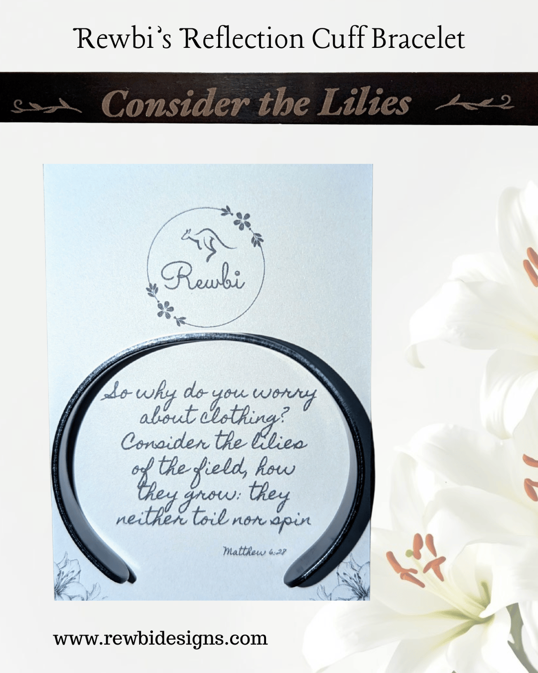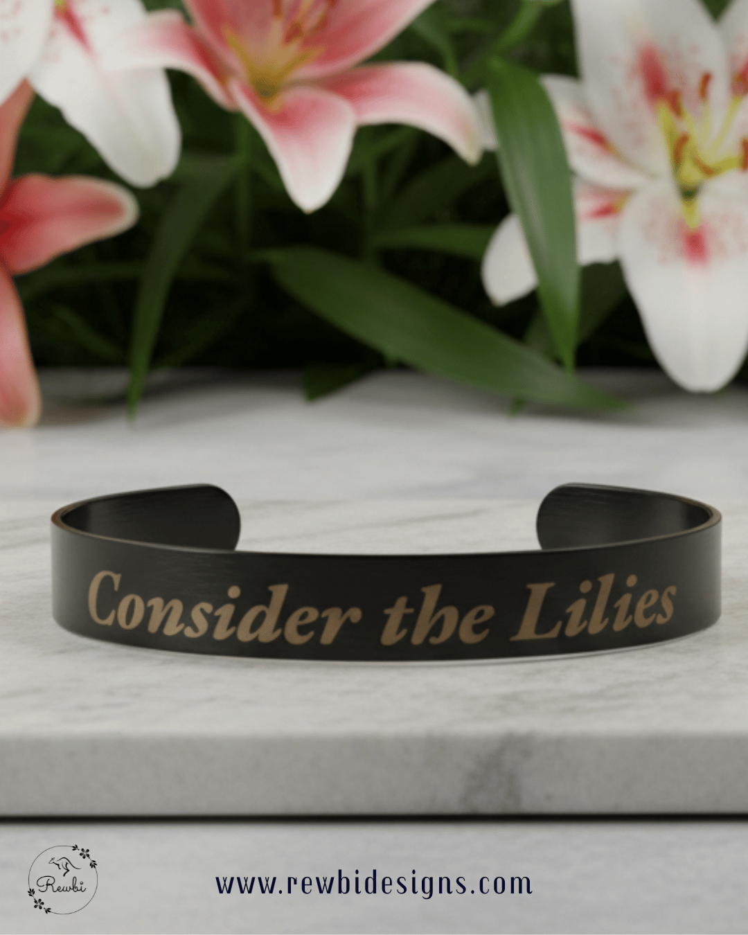 Rewbi’s laser-engraved Reflection Cuff Bracelets offer a gentle reminder to pause and reflect. In moments of overwhelm, we hope our "Consider the Lilies" Reflection Cuff Bracelet helps you let go of your worries and place your trust in God.