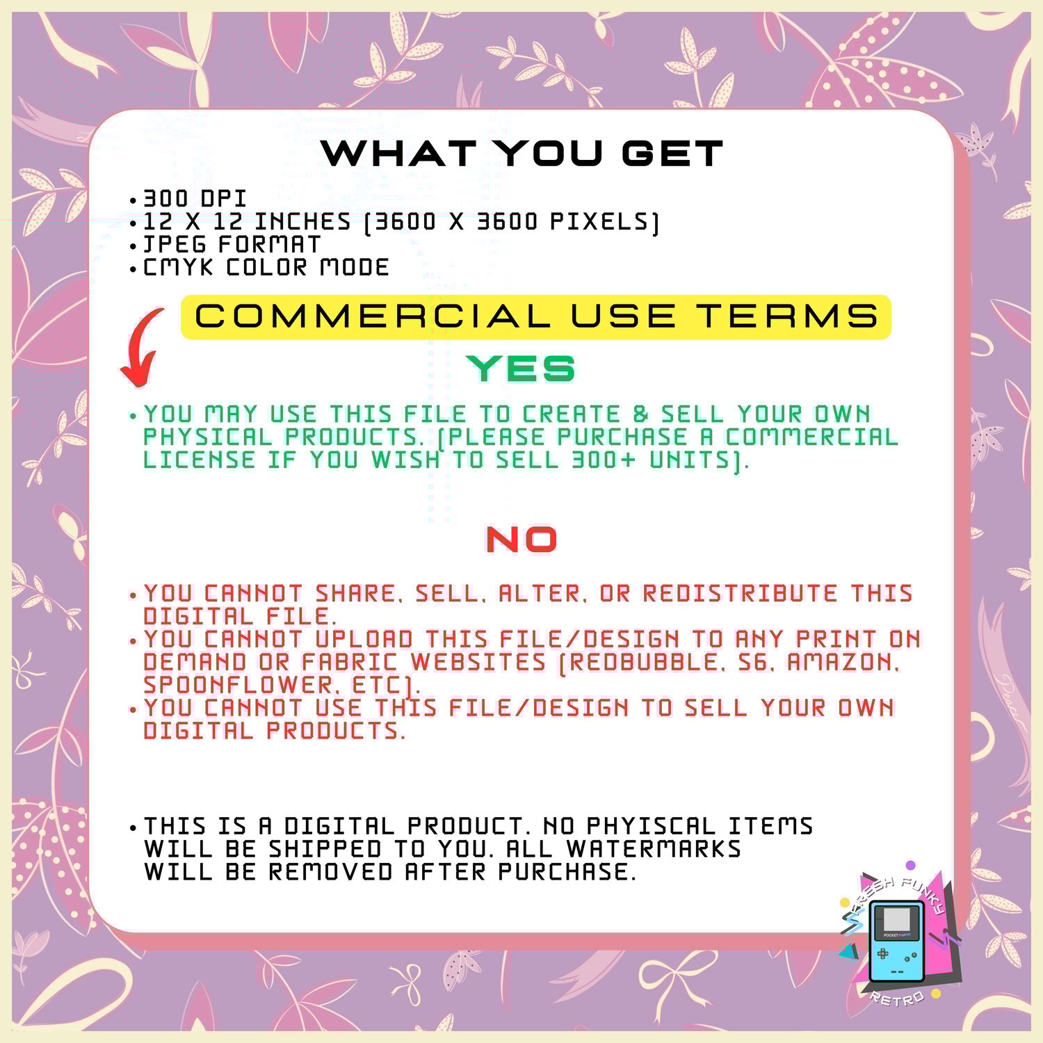 - You cannot upload this file/design to any print on demand or fabric websites (Redbubble, S6, Amazon, Spoonflower, etc).