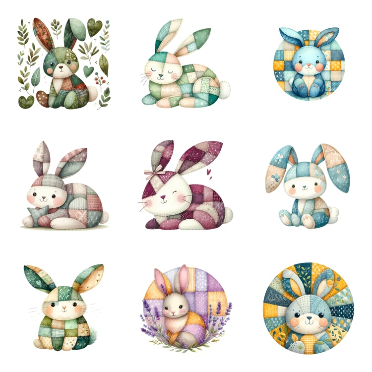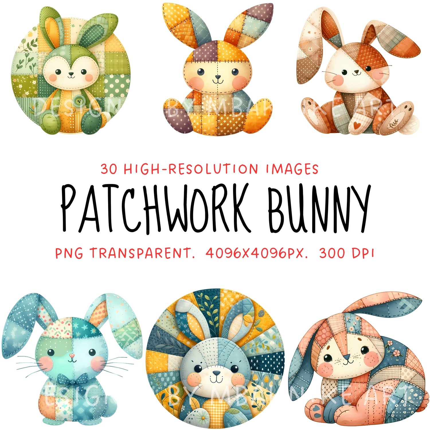 This digital product includes 30 images of Patchwork Bunny in PNG Transparent format, 300 dpi, 4096x4096 px size.