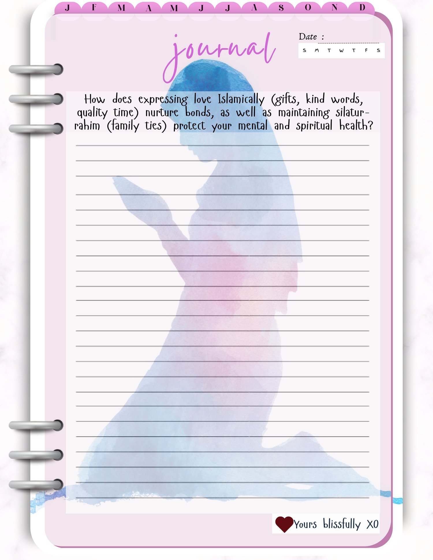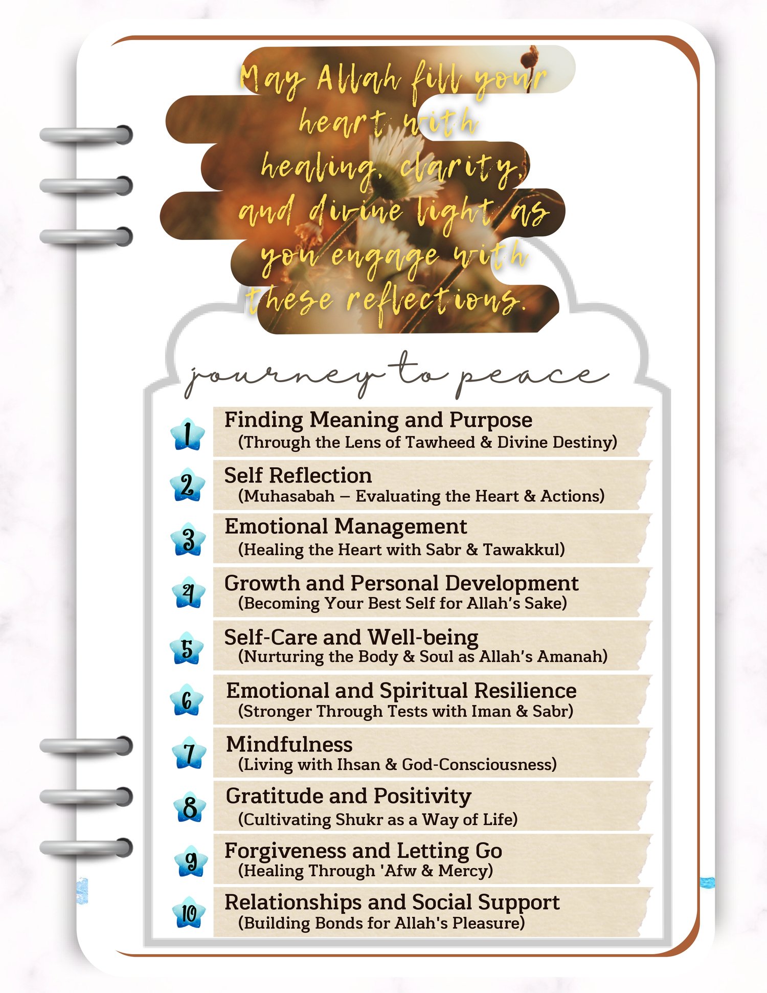 This Dated Mental Health Digital Islamic Journal 2026 is made of Daily reflection prompts based on Islamic teachings, Duas, and verses for comfort and strength, Mindfulness activities with an Islamic belief.