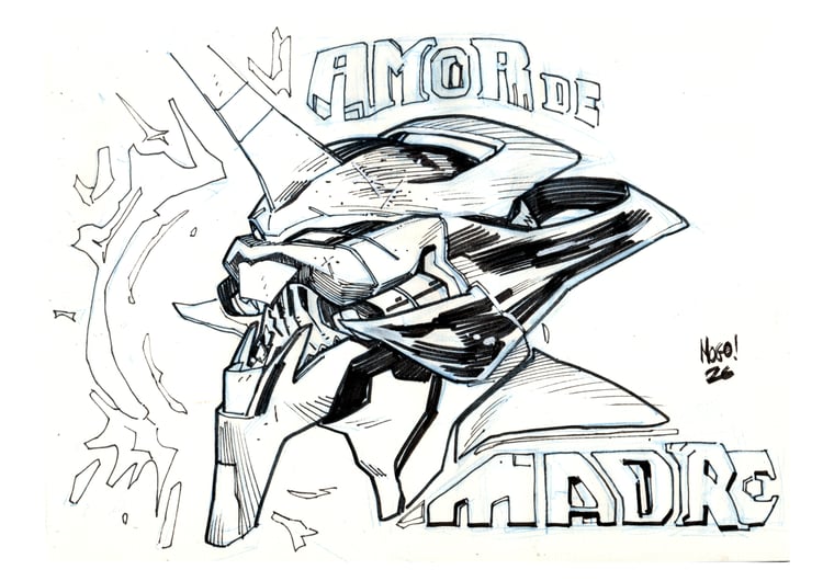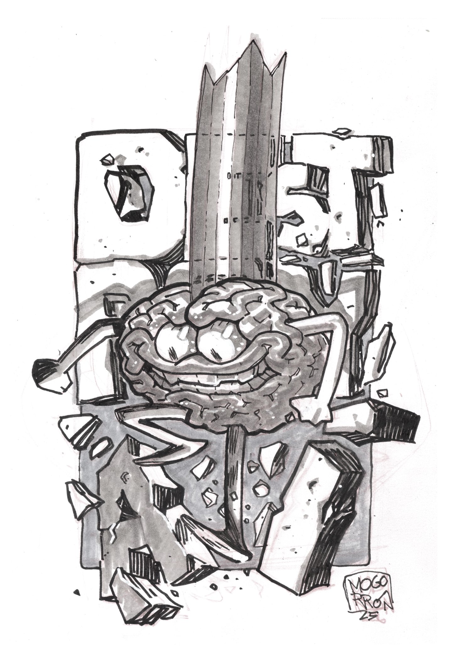 Lema de "Destroy AI" con la mascota de la editorial Underbrain. Tinta y copics sobre papel A4 de 120gr.
