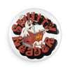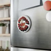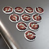 This round magnet feature a metal shell front with a magnetic backing. On the front you'll find a clear mylar/UV cover that protects the image against fading and scratches.