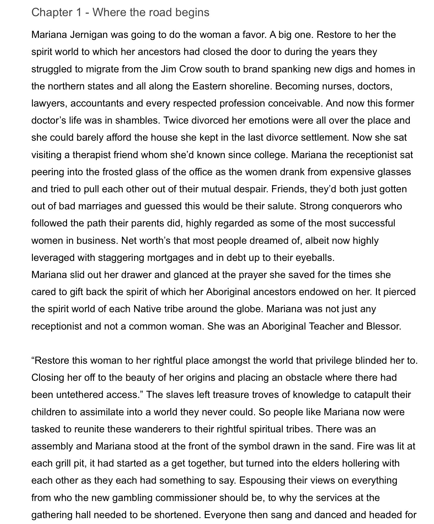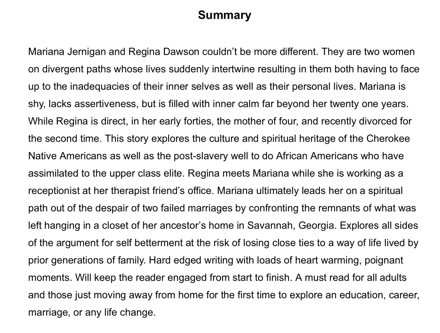 Mariana Jernigan and Regina Dawson couldn’t be more different. They are two women on divergent paths whose lives suddenly intertwine resulting in them both having to face up to the inadequacies of their inner selves as well as their personal lives. Mariana is shy, lacks assertiveness, but is filled with inner calm far beyond her twenty one years. While Regina is direct, in her early forties, the mother of four, and recently divorced for the second time. This story explores the culture and spiritual heritage of the Cherokee Native Americans as well as the post-slavery well to do African Americans who have assimilated to the upper class elite. Regina meets Mariana while she is working as a receptionist at her therapist friend’s office. Mariana ultimately leads her on a spiritual path out of the despair of two failed marriages by confronting the remnants of what was left hanging in a closet of her ancestor’s home in Savannah, Georgia. Explores all sides of the argument for self betterment at the risk of losing close ties to a way of life lived by prior generations of family. Hard edged writing with loads of heart warming, poignant moments. Will keep the reader engaged from start to finish. A must read for all adults and those just moving away from home for the first time to explore an education, career, marriage, or any life change.