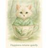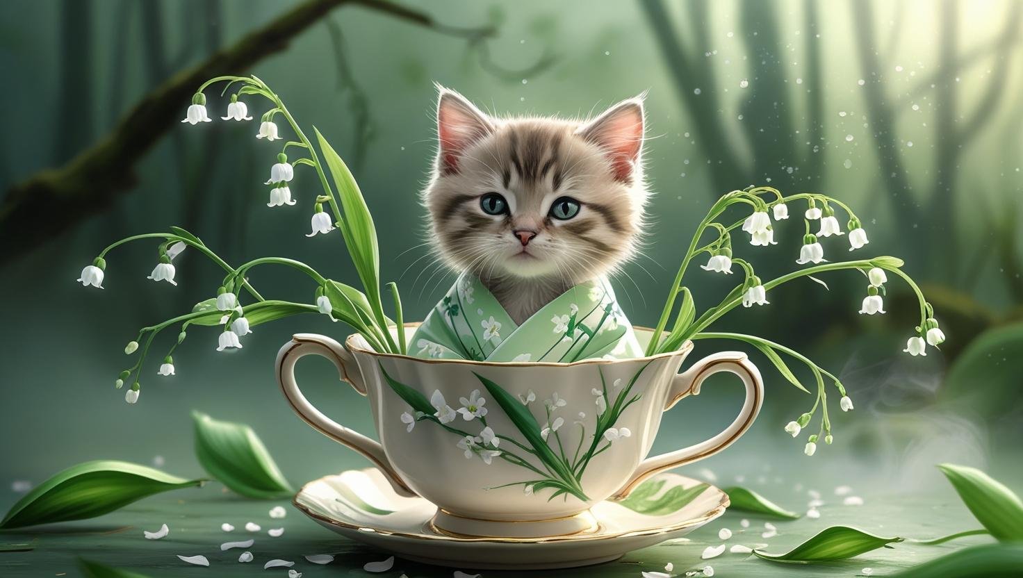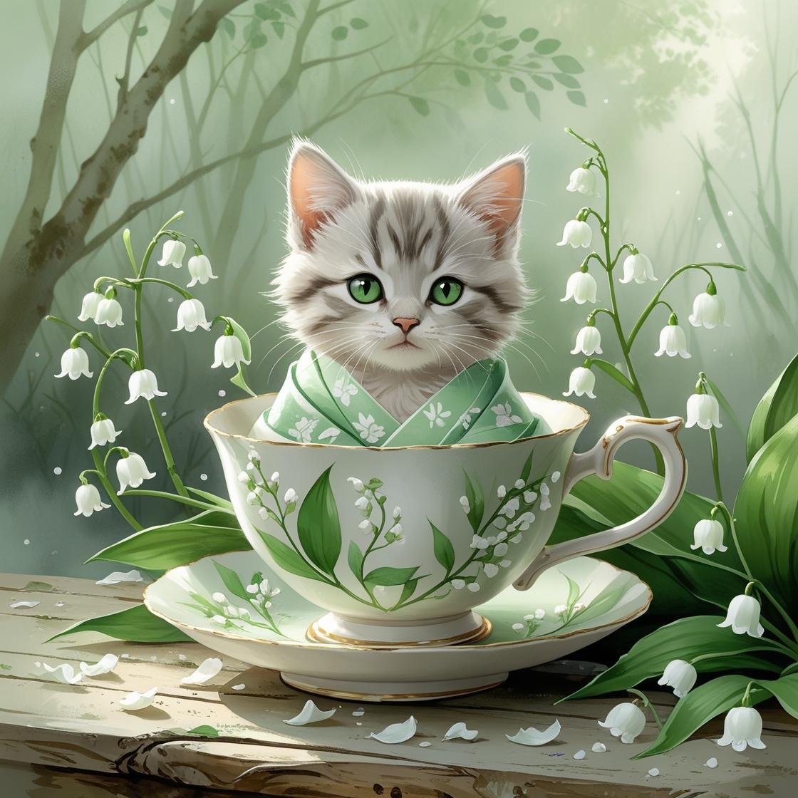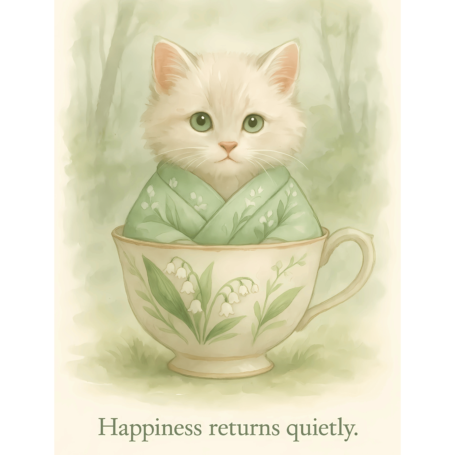 This month’s Meowmoji printable set features our softest springtime kitten yet — cozied up in a pale green kimono, nestled in a porcelain cup adorned with Lily of the Valley blossoms. Surrounded by delicate petals and soft woodland light, each piece invites calm, renewal, and sweet beginnings.