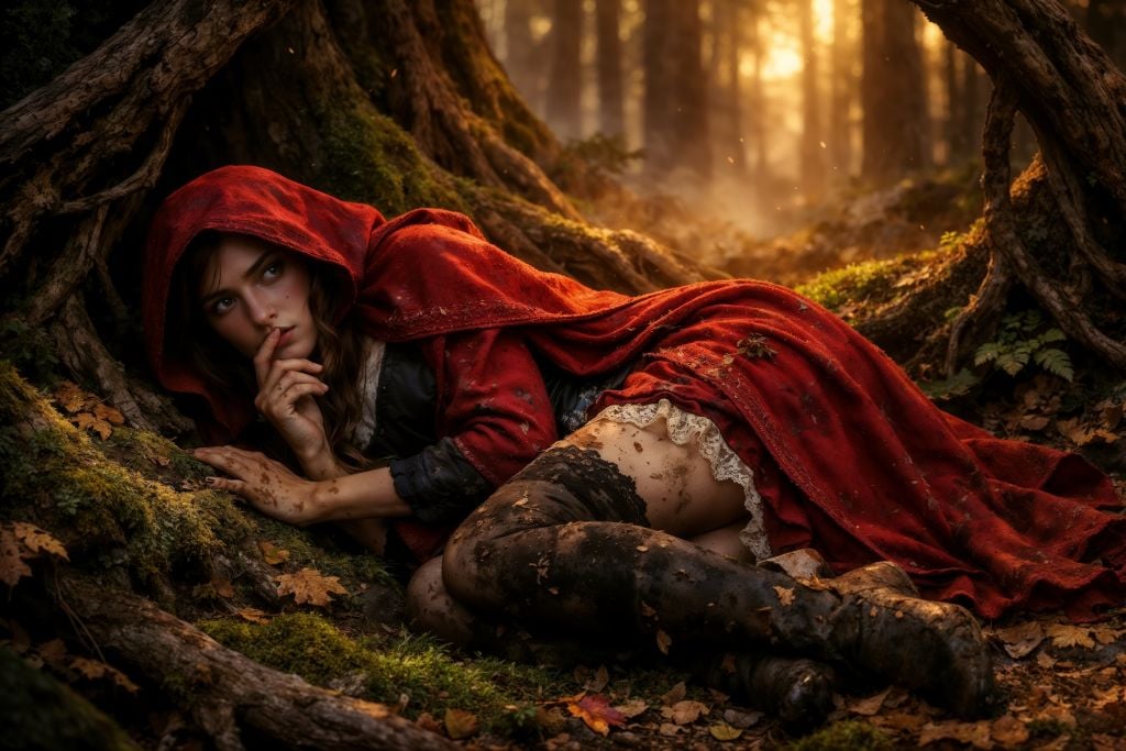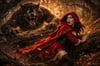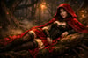 This true 10K Little Red Riding Hood artwork reimagines the legend with cinematic allure—deep crimson velvet draped like a spell, lantern-warm forest light, drifting autumn leaves, and a quiet gaze that suggests she knows exactly what’s watching from the shadows. Lace, leather, and woodland mist blend into a scene that feels both enchanted and dangerous… the moment right before the story turns.