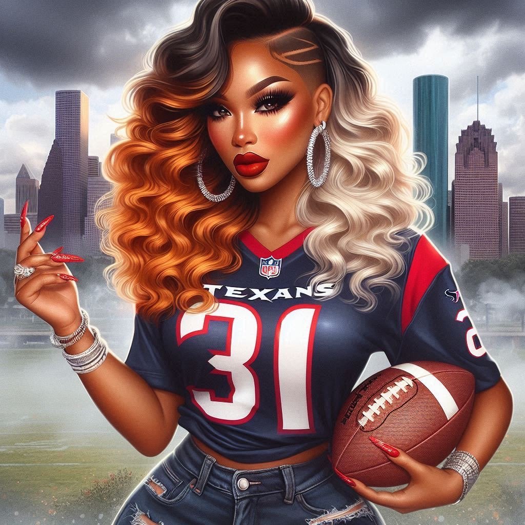 This digital download includes two stunning versions of an original Black girl football illustration featuring a fierce queen in a Texans jersey #31-one with a transparent background and one with the original cityscape backdrop.