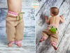 • Patons Astra Yarn by Yarnspirations; Weight category: 3 / Light; Qty: 1 (2, 2, 2, 2, 2, 3, 3, 4) skein(s) of Emerald or any other color for pants, 1⁄2 skein of any color for ribbing, 1⁄2 skein of Hot Green for face; a small amount of Black & White for eyes, Deep Pink for cheeks, Cardinal for smile, and Hot Lilac for bow (optional).