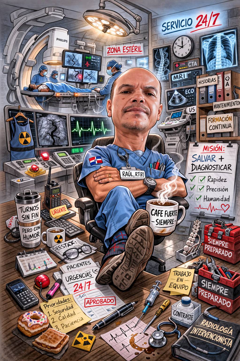 A colorful, highly detailed caricature of a confident and skilled healthcare professional in a hospital setting. You are seated in a chair with your arms crossed, wearing blue scrubs and a name badge that reads “RAÚL, RT(R).” Your facial features are slightly exaggerated in a playful, cartoonish style, emphasizing personality while keeping it respectful and professional.