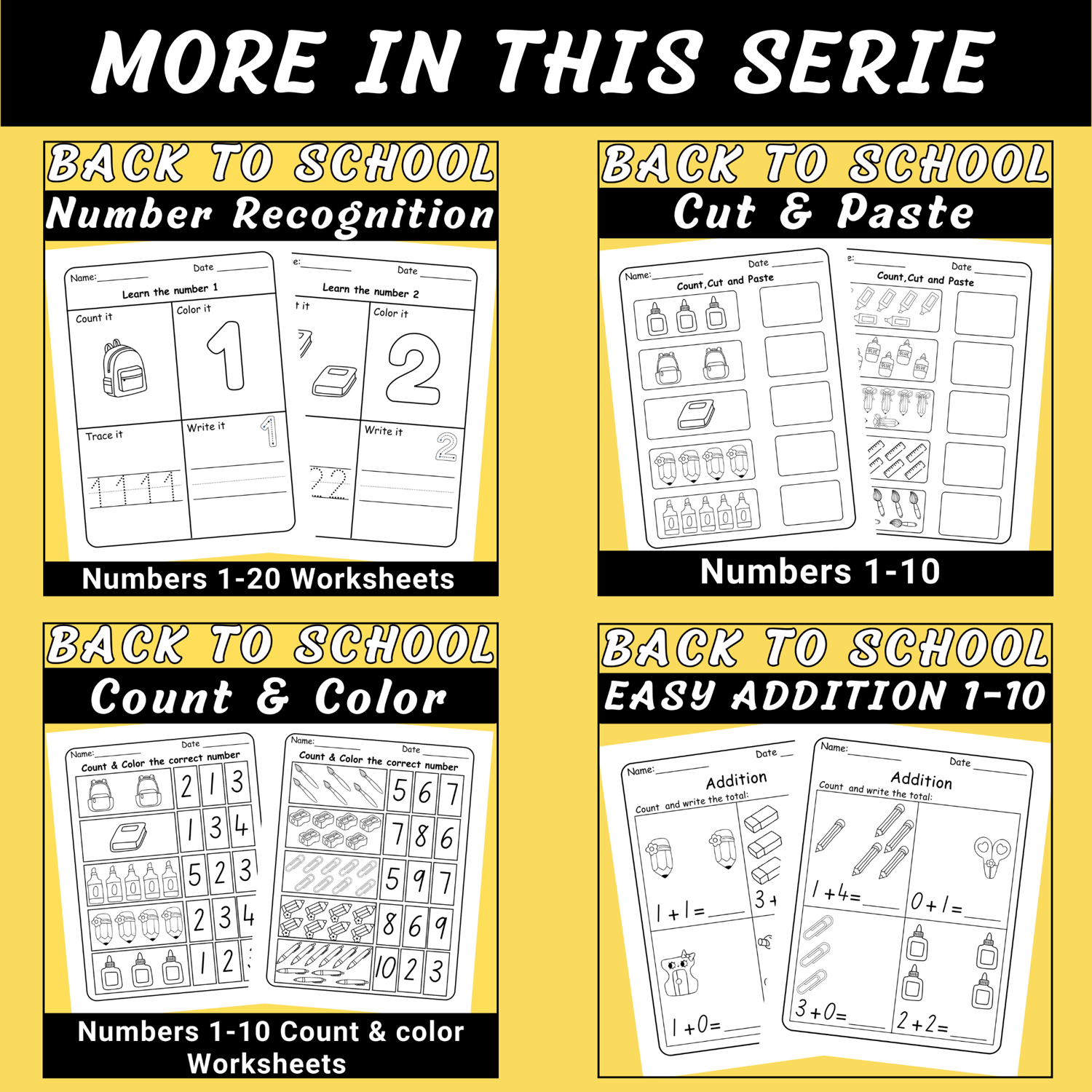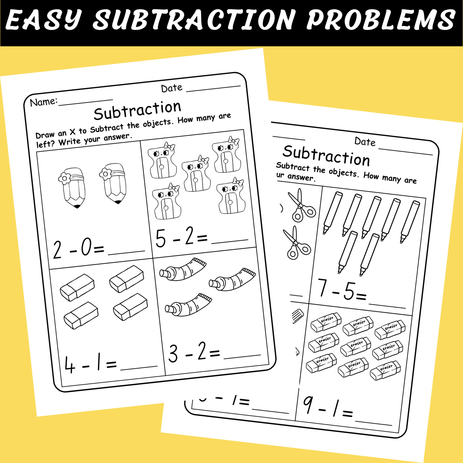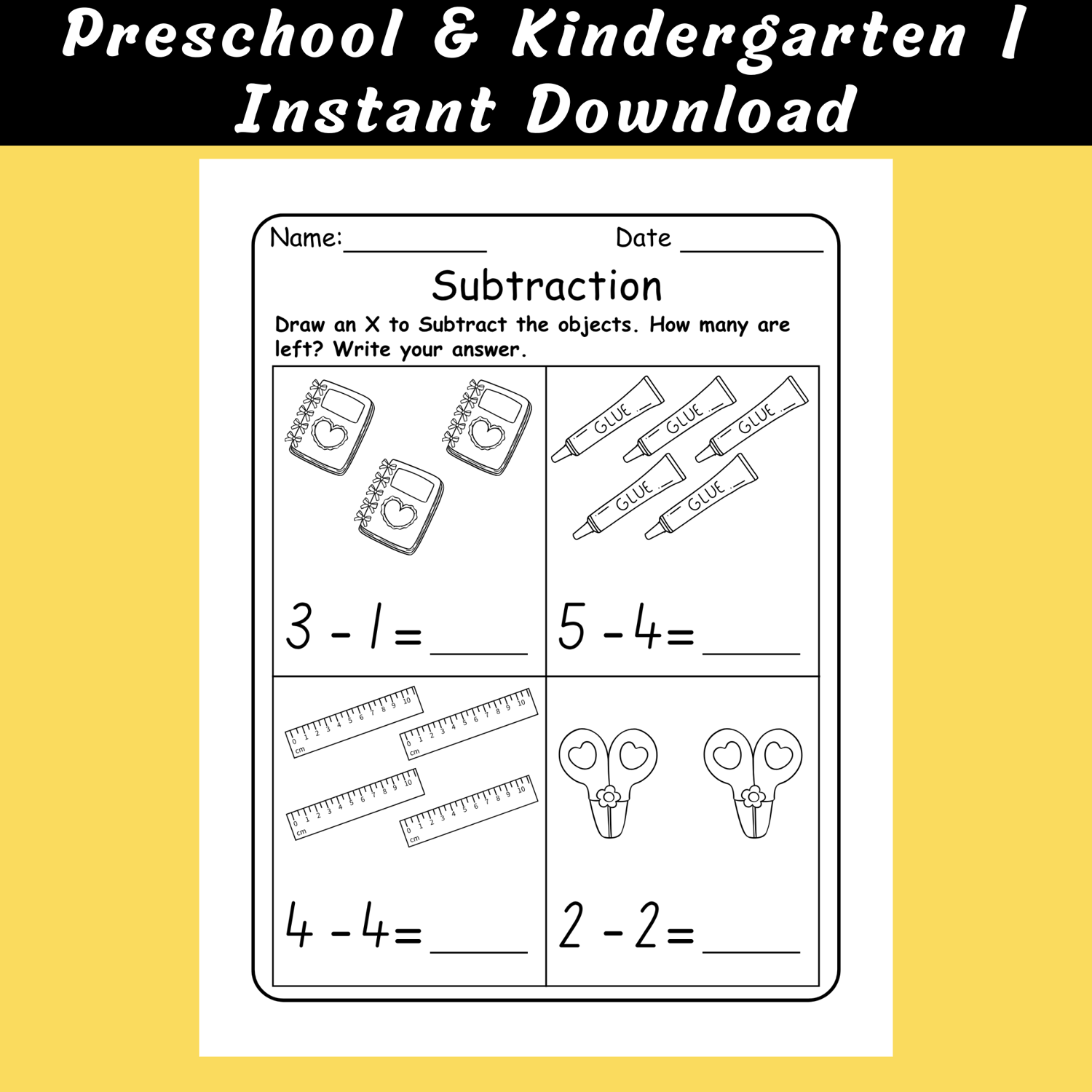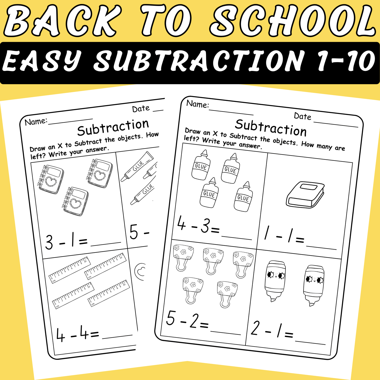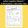 Each worksheet features a school supplies theme with crayons, pencils, glue, and rulers to keep kids motivated while building math confidence. These subtraction printables support number sense, counting, and problem-solving while giving students a strong foundation in early math skills.