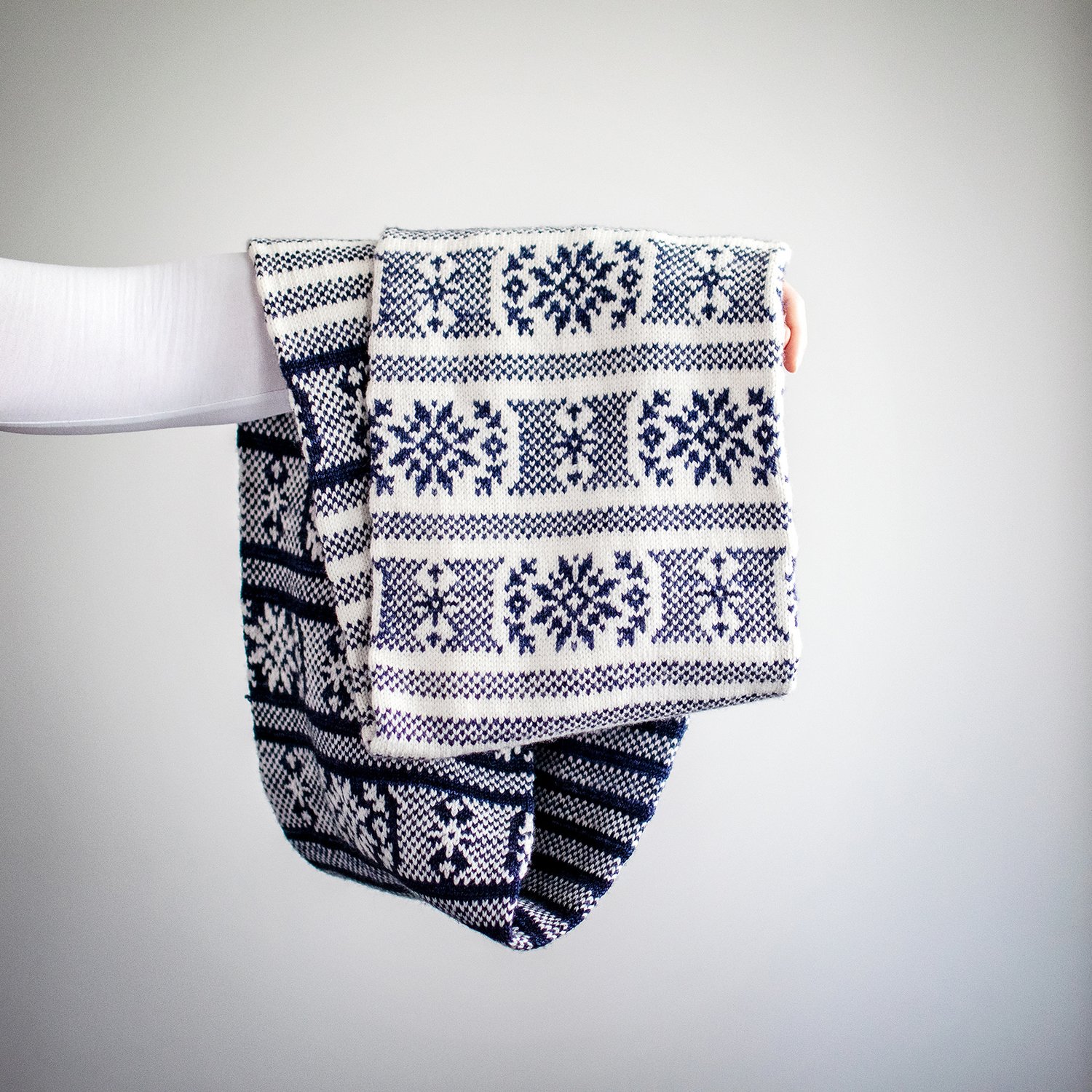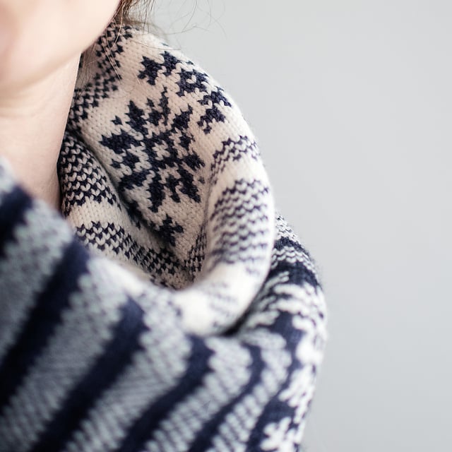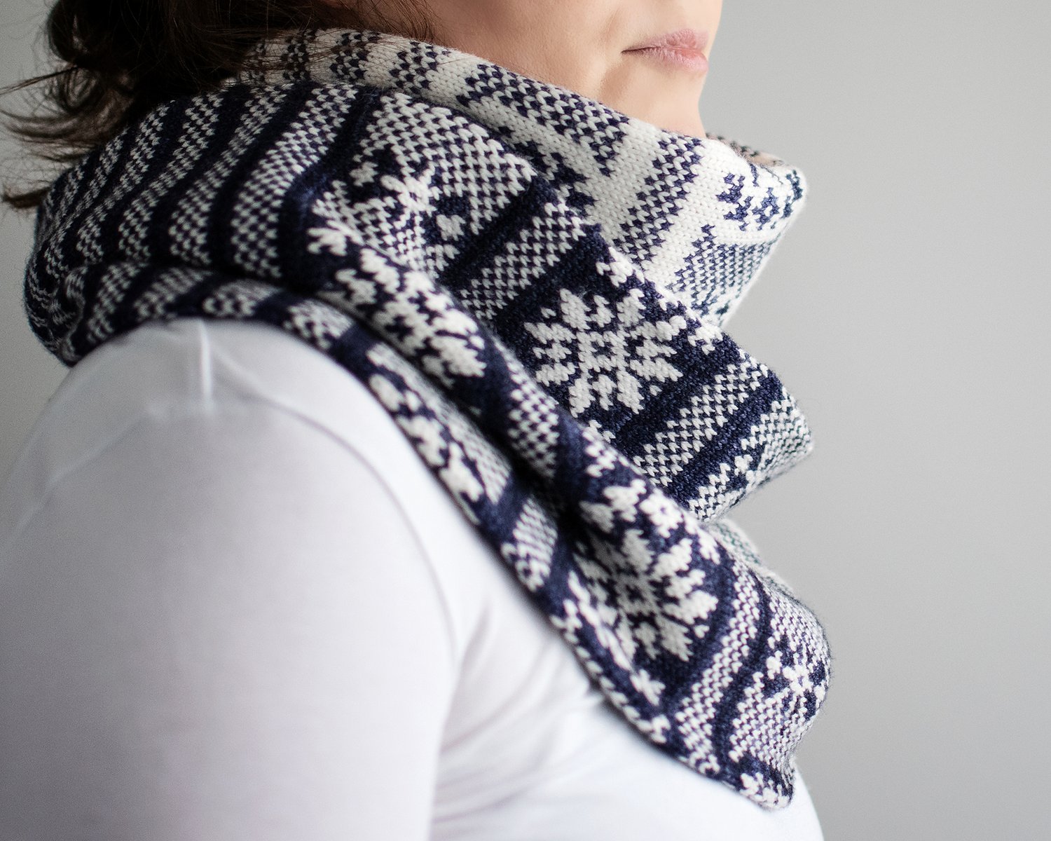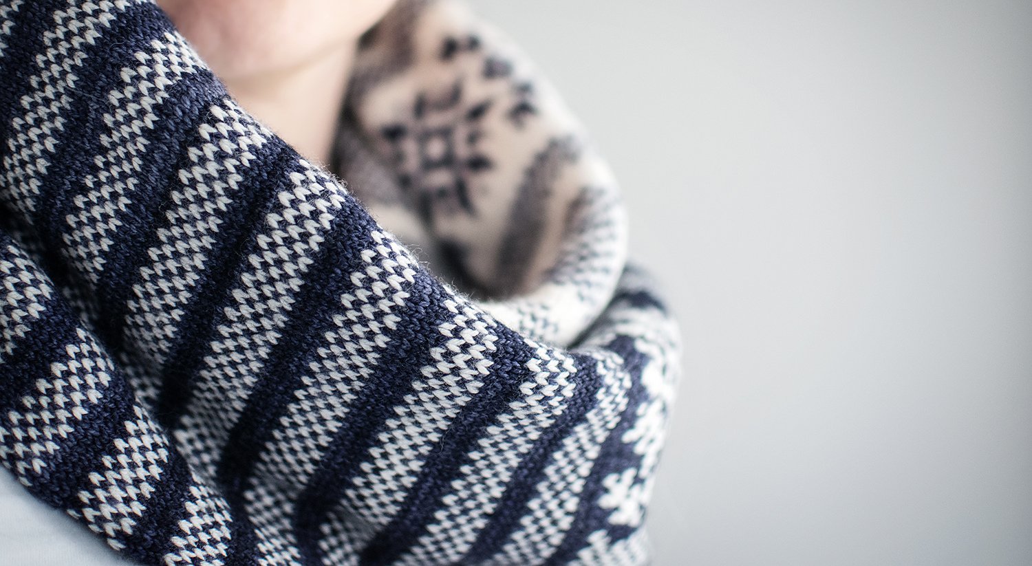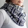 The cowl is worked as a long tube starting from a provisional cast on, and grafted together at the end. It consists of two large colorwork sections. In each section, bands of large decorative motifs are separated by simple colorwork stripes. The MC and CC colors are switched in the second colorwork section, resulting in a study in contrasts.
