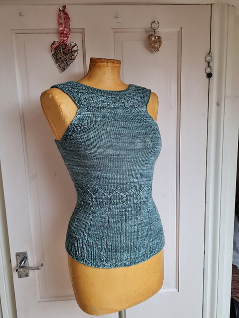 stitch over the bust. The garment is knit in the round until armhole level and then