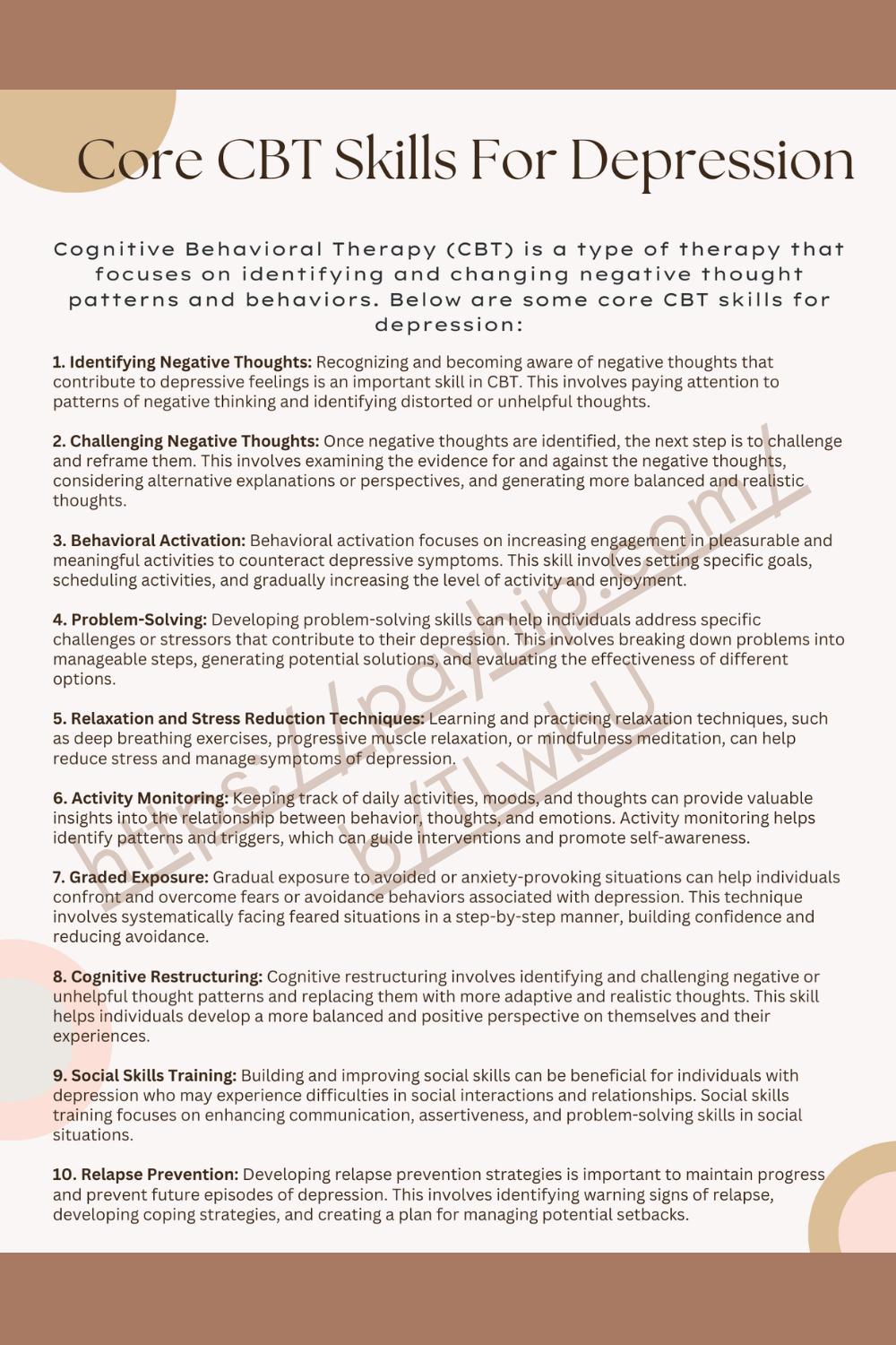 This worksheet offers 10 core CBT skills that can be used for managing depression. CBT is a therapeutic modality that helps folks understand how their thoughts, feelings, and behaviors are all related. The evidence based practices of CBT can offer powerful concrete tools and skills to help an individual manage and better understand their symptoms of depression.