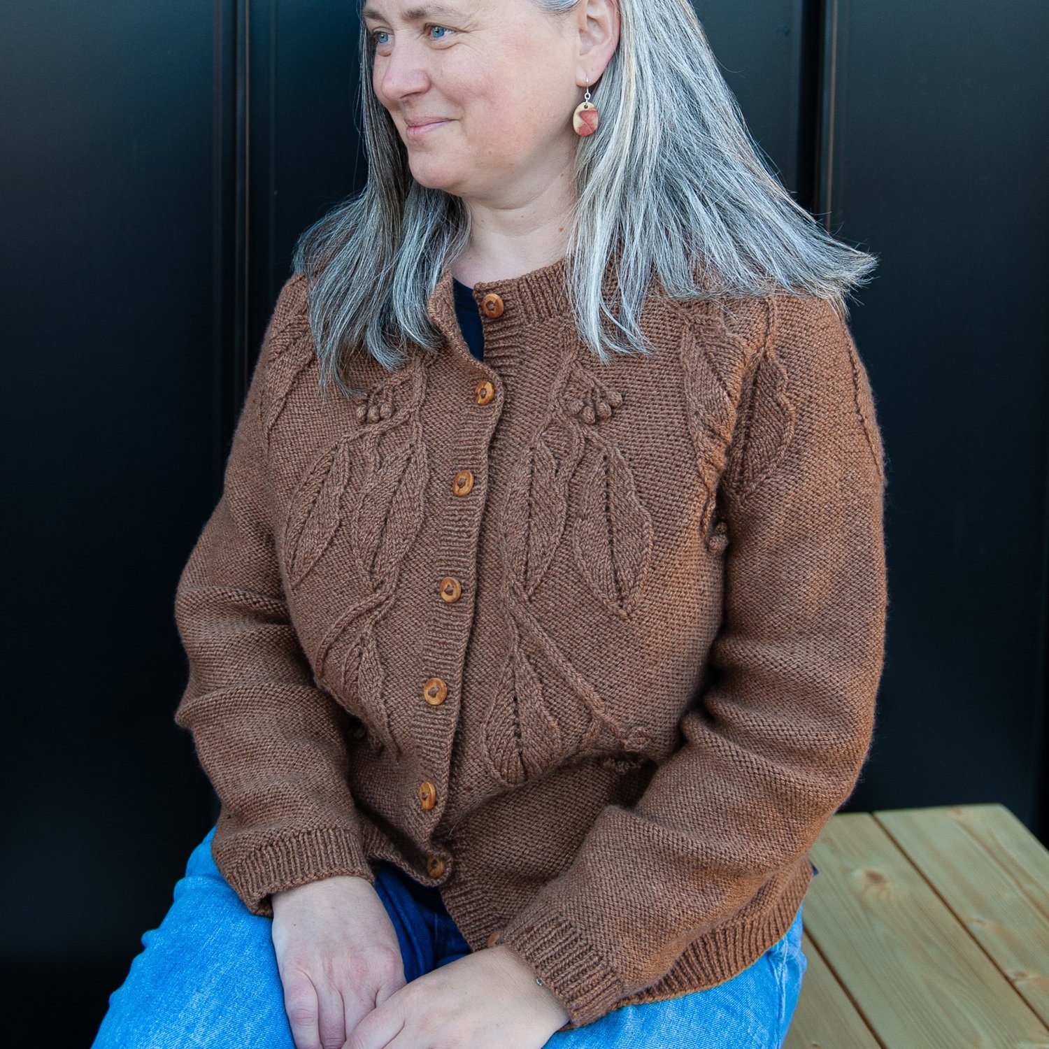 The Olive Grove Cardigan is a wonderfully rustic cardigan that instantly evokes daydreams of visiting ancient olive orchards, where we can watch the olive harvest, touch a tree over a thousand years old, and follow it up with a delicious outdoor picnic. Just a little bit roomy and not too long, this cardigan is designed to be worn layered over other garments. The fronts of the cardigan measure wider than the back for improved fit and is knit in one-piece, top down, following charted motifs. The main body is worked in rows with a background of Reverse Stocking Stitch; but the sleeves are worked inside-out, in the round (knit side facing), for your convenience and knitting pleasure.