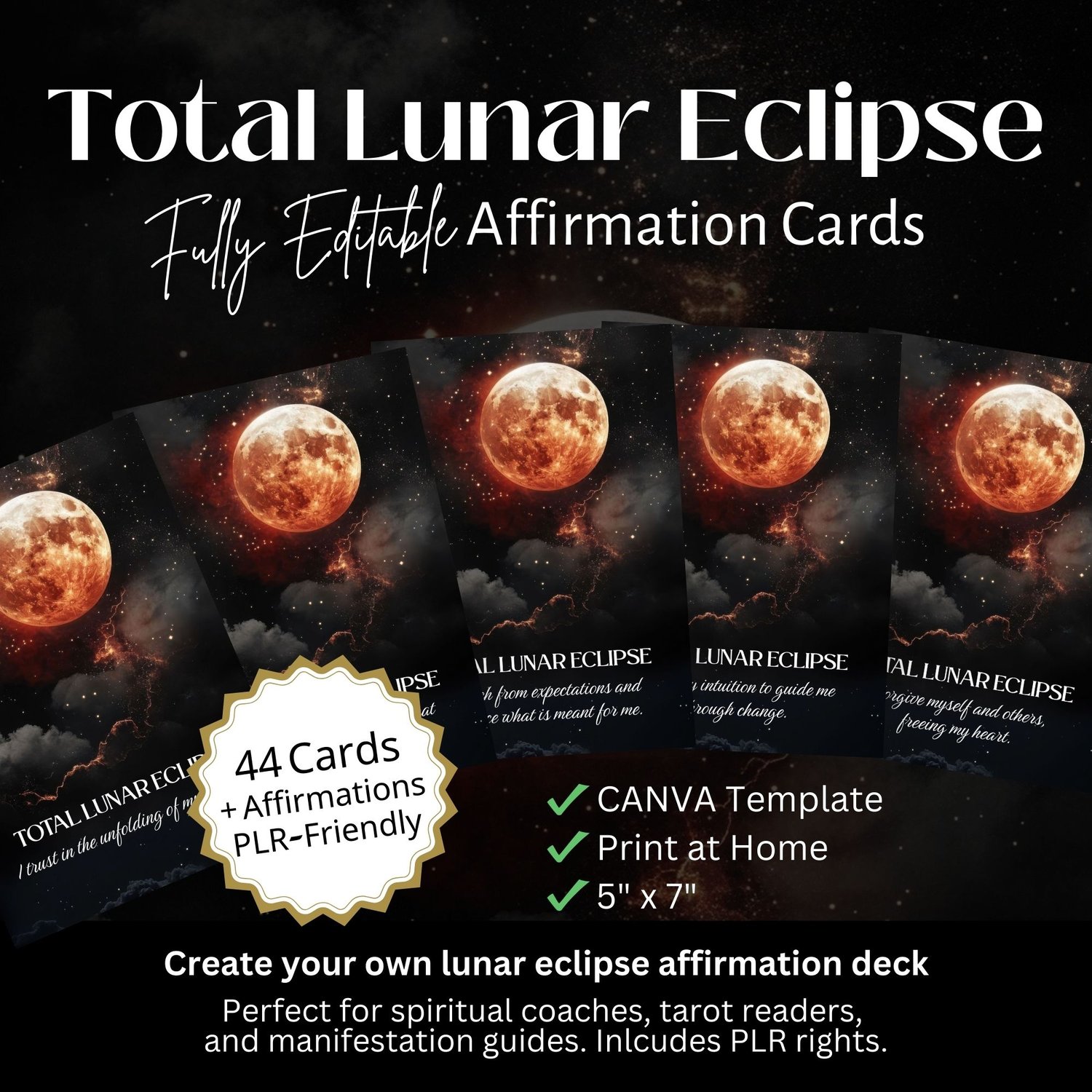 Lunar Eclipse Affirmation Cards – Printable Moon Manifestation Deck & Vision Board Kit (PLR Canva Template)
