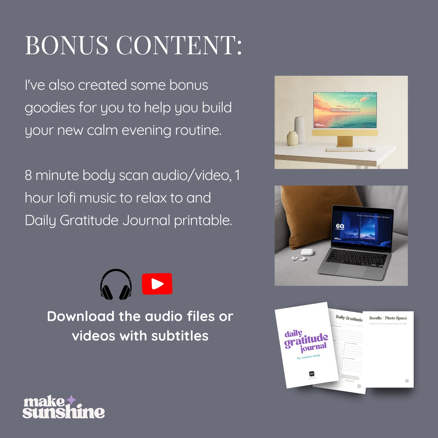 ✅ BONUS content - 8 minute body scan audio/video, 1 hour calm lofi music audio/video and a printable Gratitude Journal