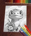 Baby Flower Dinosaur #3 Fantasy Coloring Page, Adults + kids- Instant Download Grayscale Coloring Page, Printable PDF, Dragons coloring
