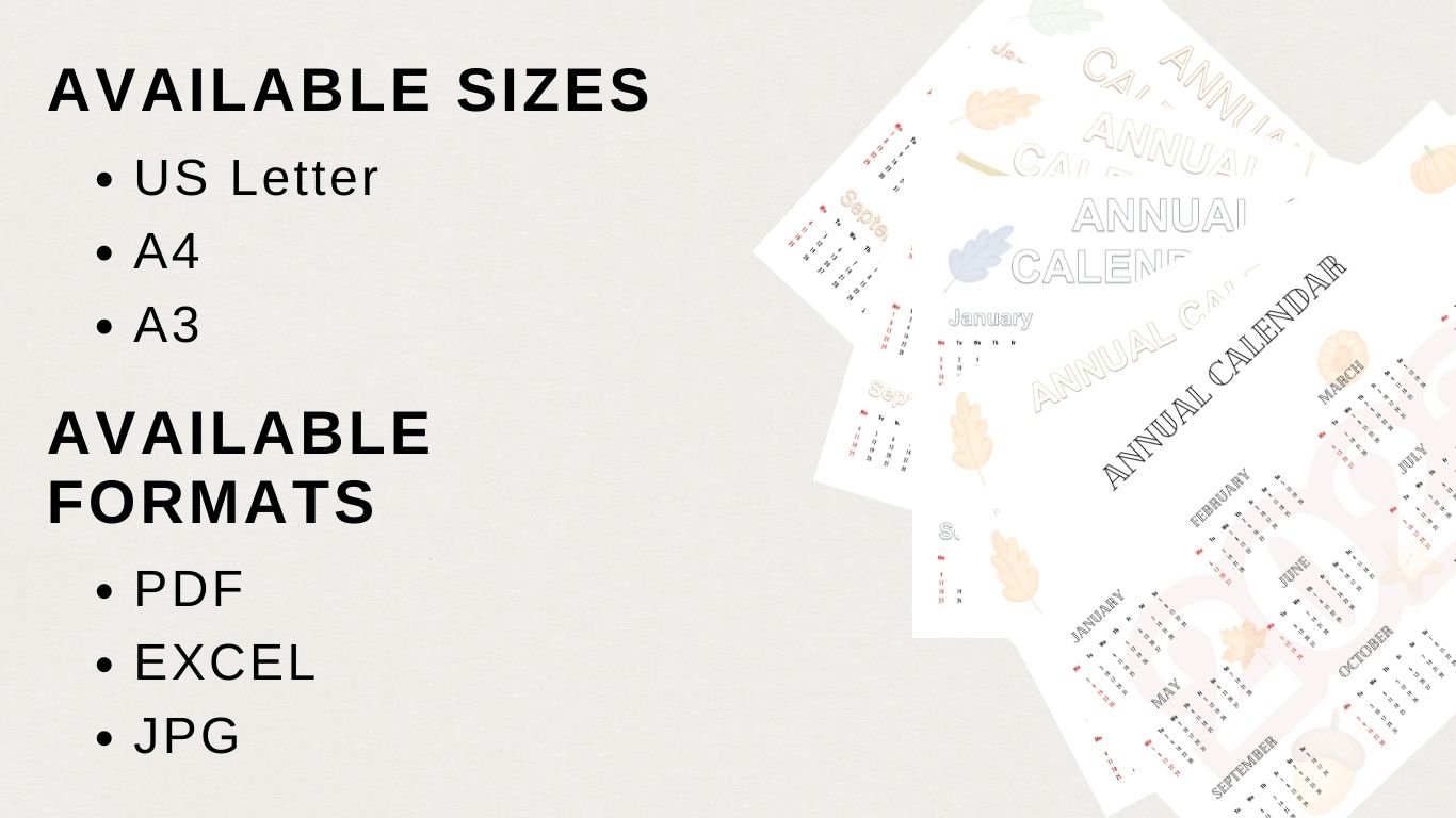After your purchase you will receive 2 zip folders (2022 and 2023) containing 6 PDF files each (Monday Start A4, Sunday Start A4, Monday Start A3, Sunday Start A3, Monday Start Letter, Sunday Start Letter). Your files will be available to download once payment is confirmed.